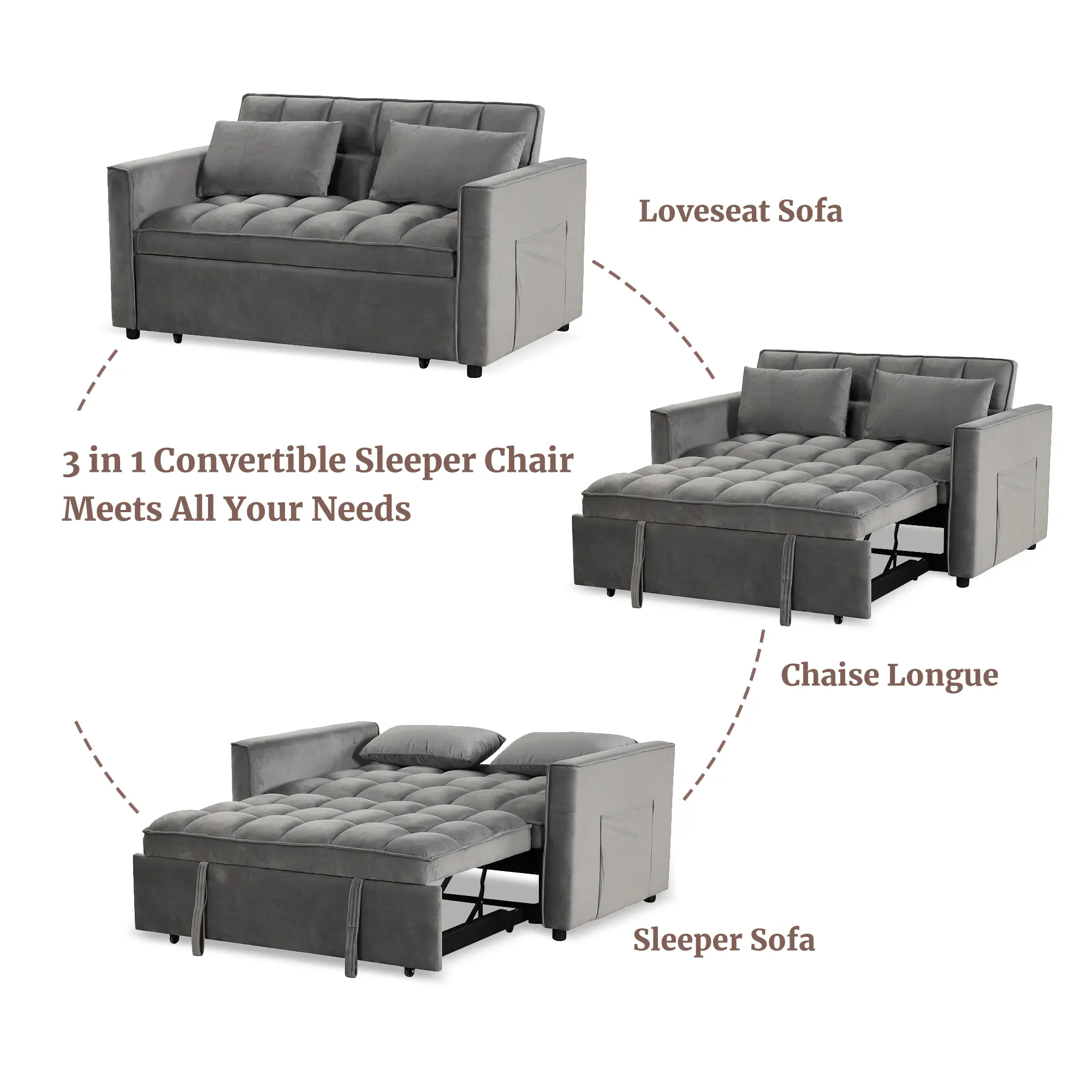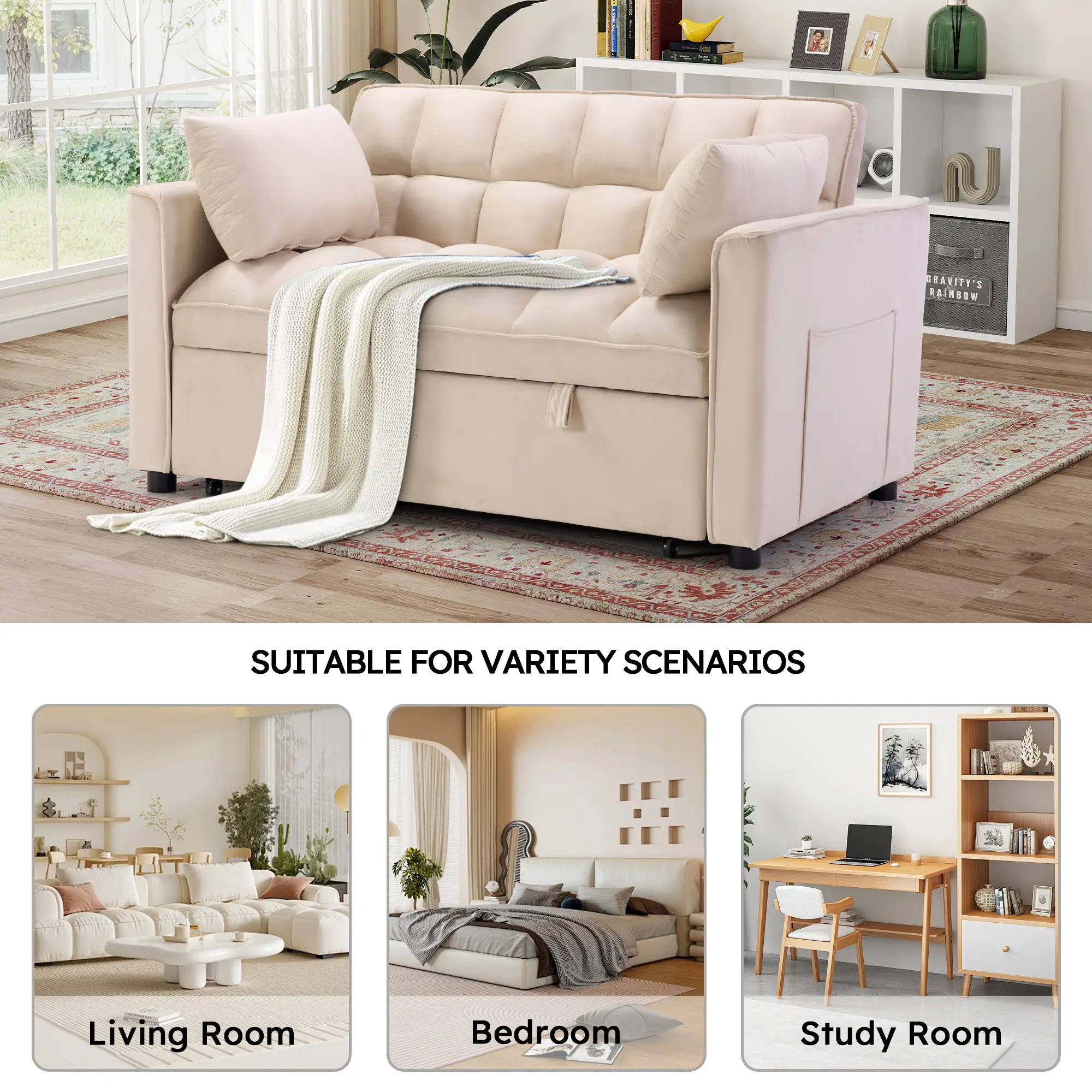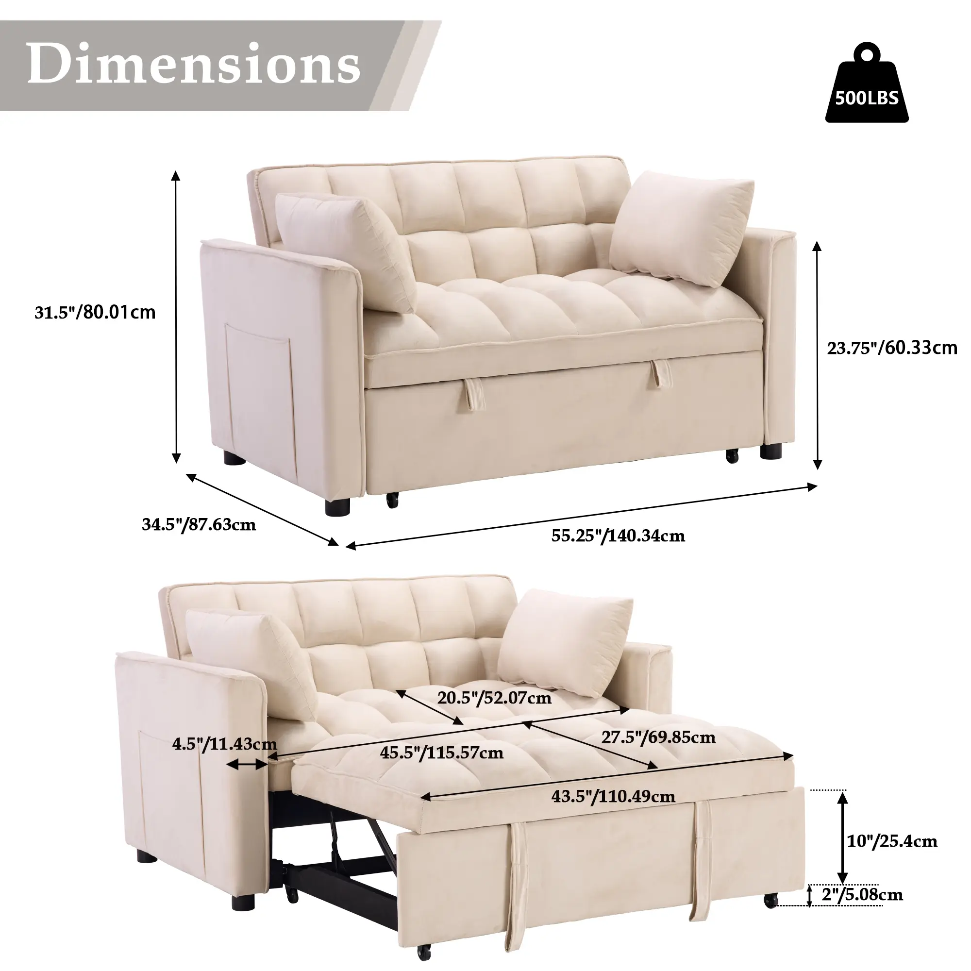 It was hard to put together had to drill pre-holes to get the wheels on, arms will not go on had to hammer down the legs that come with it. The Bed part is hard to Come out. All know, not satisfied with the couch.