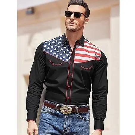 5. COOFANDY Men's Casual American Flag Button Down Shirts Slim Fit Long Sleeve Shirt Menswear Apparel Costume Cowboy Costume Cowboy Longsleeves Tops