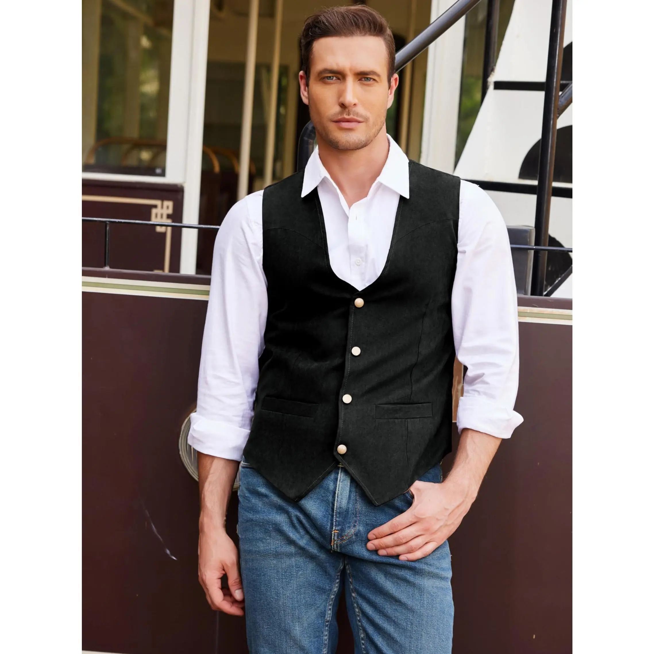 ·DESIGN- Men's Leather Vest ,Authentic western style leather vest, with well make, design perfect details ,front have four Button Closures and two real welt pockets.