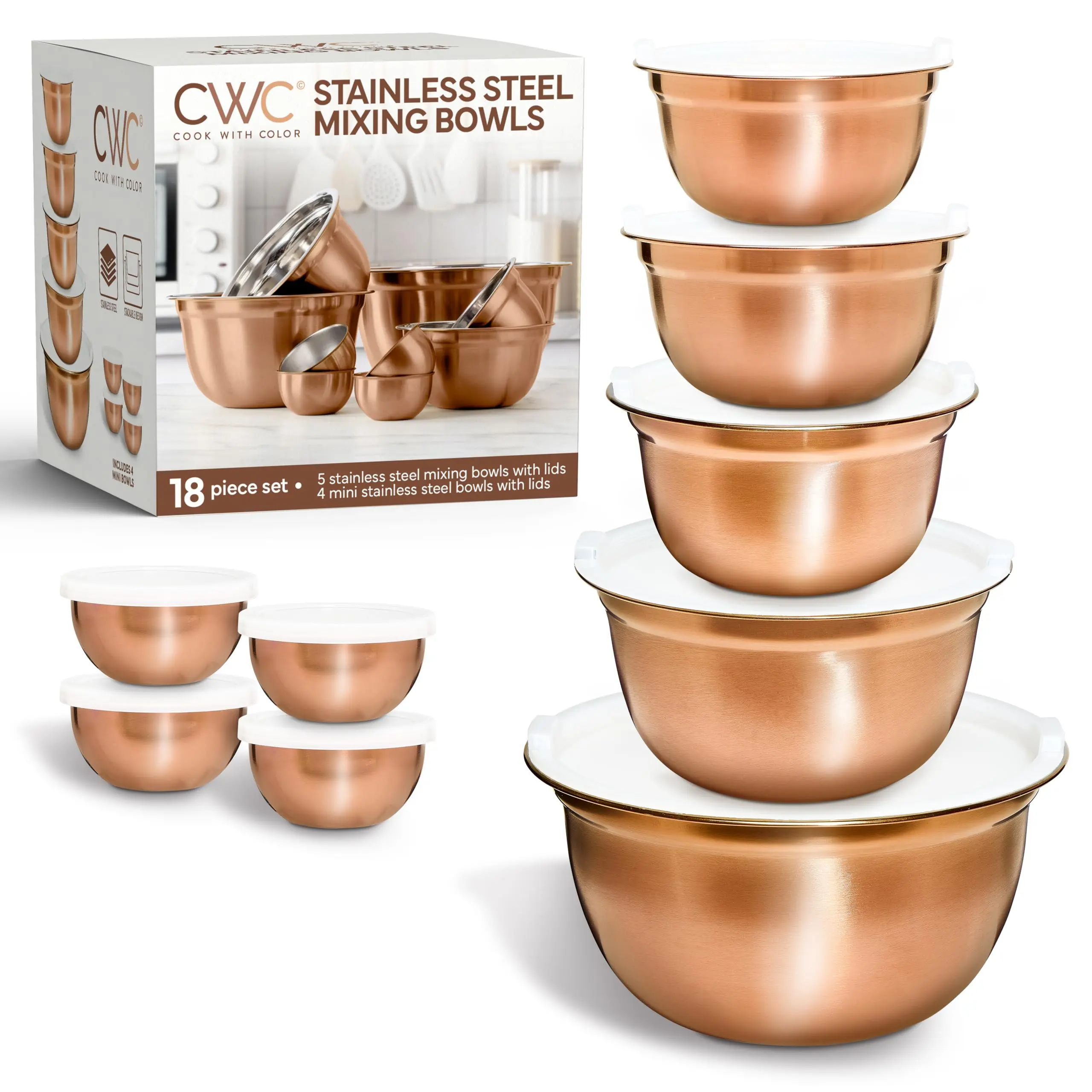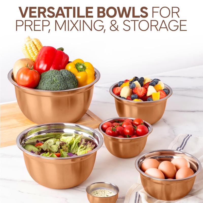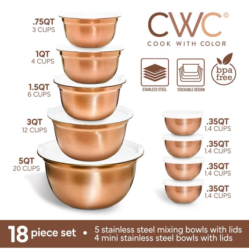·18-Piece Set – Includes 5 stainless steel mixing bowls with lids: 0.75QT, 1QT, 1.5QT, 3QT, and 5QT – plus 4 mini bowls (0.35QT / 1.4 cups) for dips, snacks, or sauces. A complete, stackable set perfect for prep, storage, and serving.