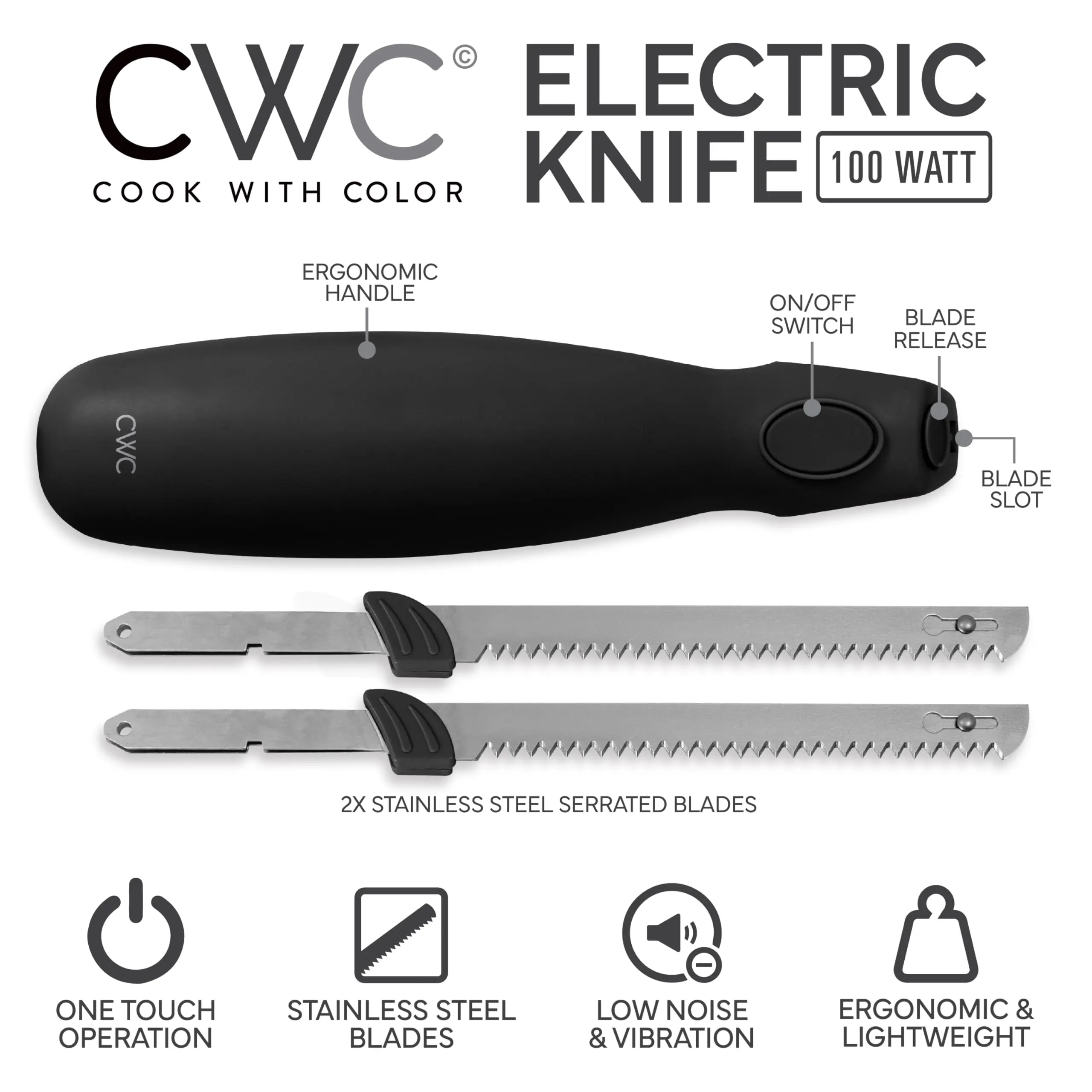 ·Powerful and Efficient Cutting: The COOK WITH COLOR Electric Knife features a 100W motor operating at 120V/60Hz, offering exceptional performance for fast and precise cutting of meat, bread, vegetables, and more.