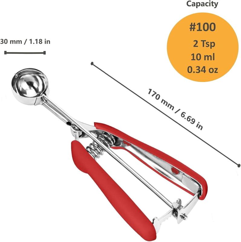【MULTI USES】 #100 cookie scooper for baking is about 2 Tsp/10ml/ 2/3 Tbsp/ 0.34 oz. Diameter is 1.2 inch/30 mm. You can use it as cookie scooper, cookie dough scoop, cupcake scoop, meatball scoop, melon baller scoop, food ball maker, sorbet scoop, even as measure spoon to satisfy kinds of different needs. 【NON-SLIP GRIP, 18/8 STAINLESS STEEL】The ice cream scoop is made of 18/8 stainless steel that is food grade stainless steel. So, it can keep sturdy and safe and ensure reliability. It won't corrode, and keep firm. These superior batter scoops never contain harmful chemicals or others to leave into your food. With soft and thick rubber handle, non-slip, easy to grasp. 【WITH TRIGGER RELEASE, EASY TO USE】Only a simple squeeze can make the cookie scooper to release the food easily and neatly. Due to Stronger spring trigger system and rubber non-slip grip, the ice cream scooper set can perfectly relieve pressure on your wrist and hand when you use it. It makes scooping food a breeze. The handles fit hands comfortably. Easy to use. 【SUPER KITCHEN HELPER, SAFE YOUR TIME】It can create beautiful food balls like ice cream, sorbet, fruit, and meatballs, melon balls, and perfectly portioned cookies, cupcakes, muffins. And release the food balls easily to cups, trays, cones and bowls. Suitable for using at home, in restaurant, dessert house and ice cream parlor. 【DISHWASHER SAFE, EASY TO CLEAN】Hand wash, and dishwasher safe. Very easy to clean. Different from other inferior stainless steel, this cookie dough scooper for bakin is made of 18/8 stainless steel. Make it to be a long-lasting kitchen tool. Great for bridal shower, wedding, engagement, anniversary, birthday, hostess and housewarming gifts, holiday gifts like Mother's Day gifts.