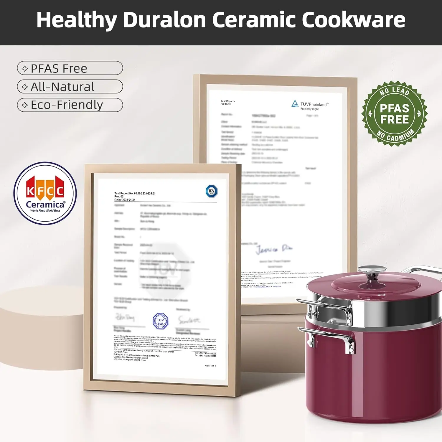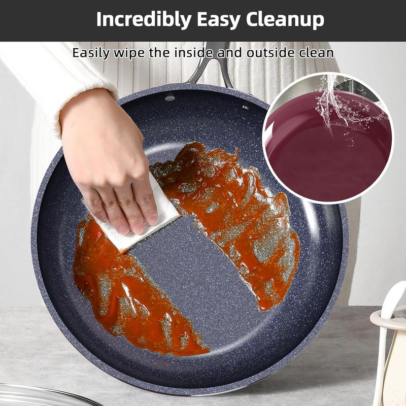 The cookware set is not only beautiful but works great. My only complaint is that the handles on the lids get hot. Their non-stick surface is top notch and they heat evenly on the bottom. Plus, they're easy to clean!