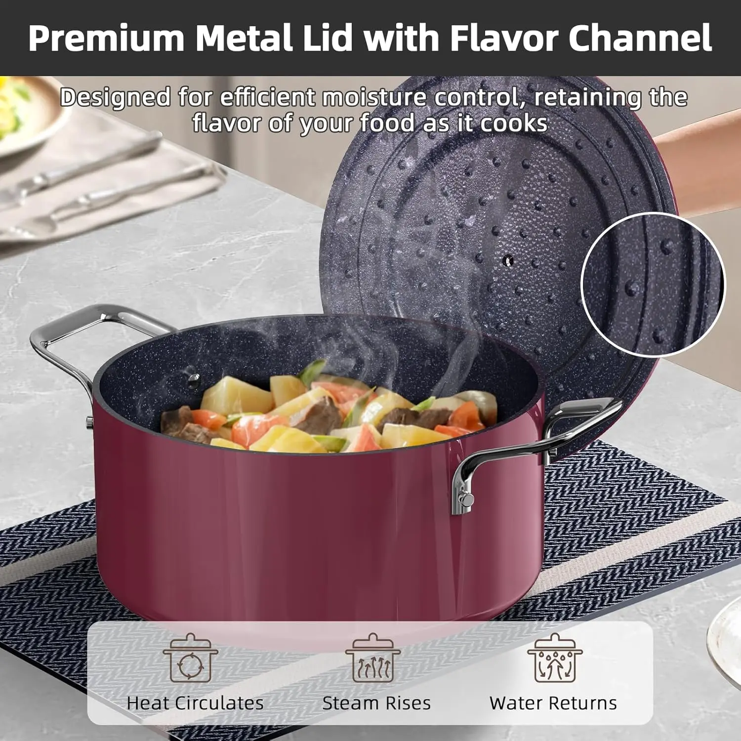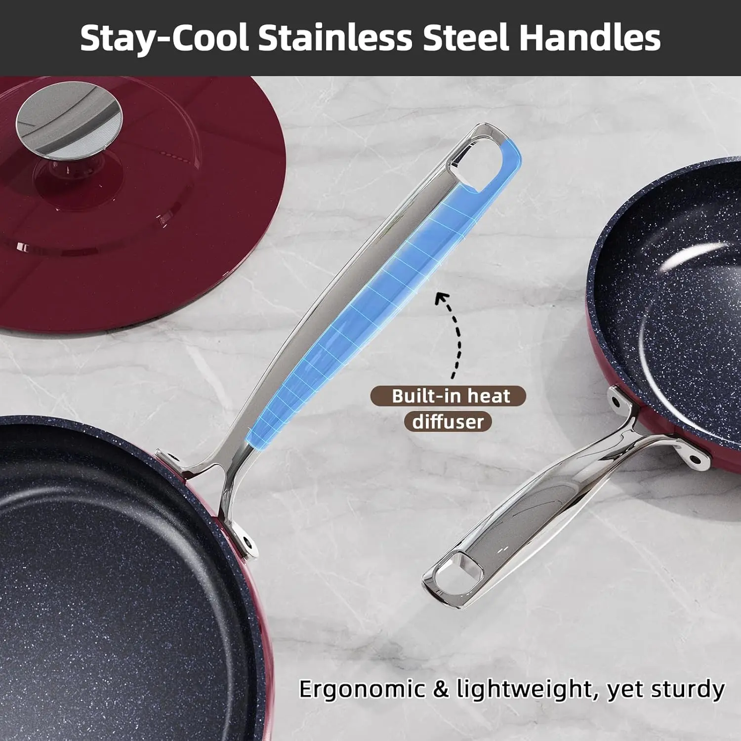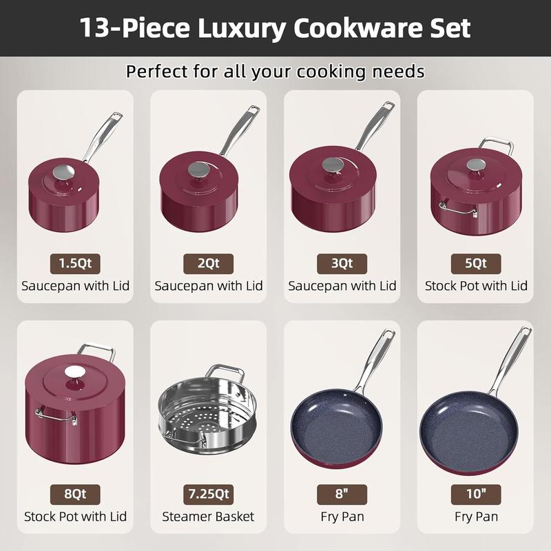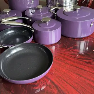 What a beautiful set. I got the cinnamon color and it is a very cheerful color. The cookware is heavy, the blue lux finish is truly non-stick, and warm up time is fast. The temperature holds throughout the cooking cycle but the handles are pleasantly cool to the touch. The lids retain the liquids well so ensure you adjust your liquids accordingly because there is not much evaporation. I would say I’m very pleased with this beautiful set and recommend it without reservation.