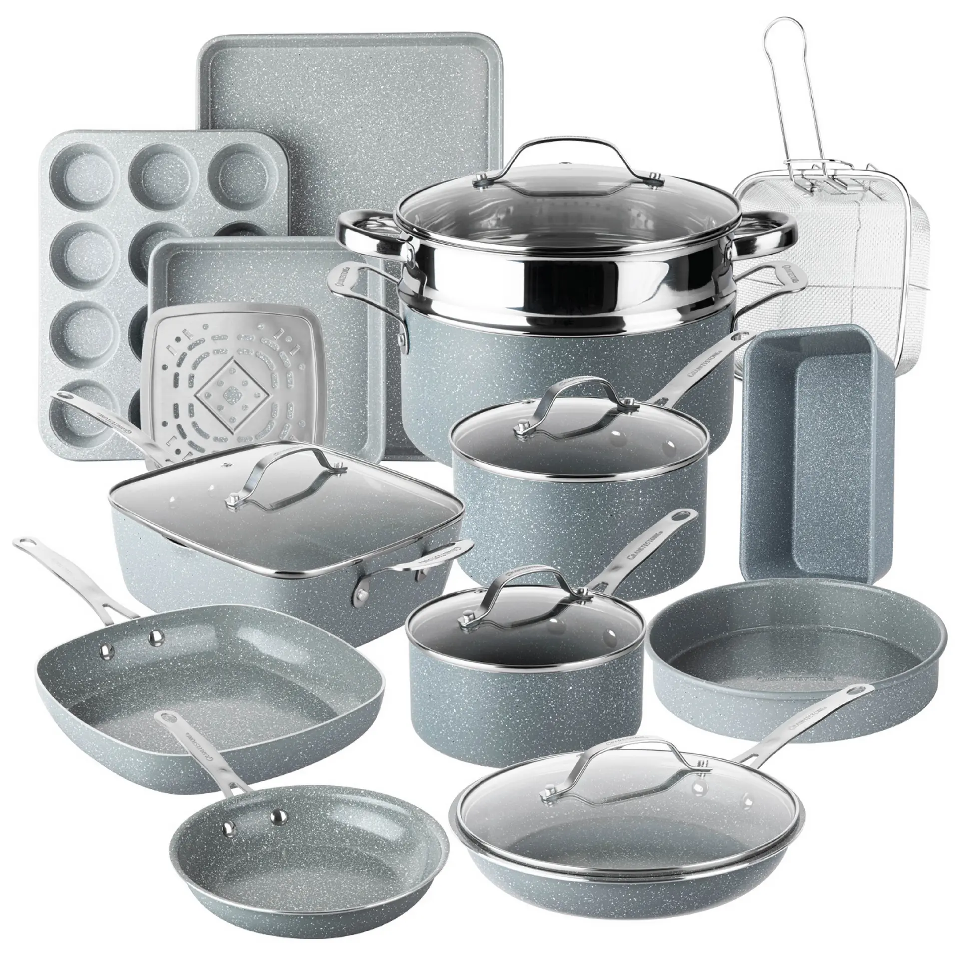 ·20 Piece Ceramic Cookware and Bakeware Set: 8.5" Frying Pan, 10.25" Frying Pan With Lid, 9.5" Square Pan with Lid, 1.5Qt Sauce Pan With Lid, 2.5Qt Sauce Pan With Lid, 9.5" Deep Square Pan, Fry Basket, Steamer Tray, 5 Qt Stock Pot With Lid, Steamer, Round Pan, Loaf Pan, Square Pan, Muffin Pan, Cookie Tray