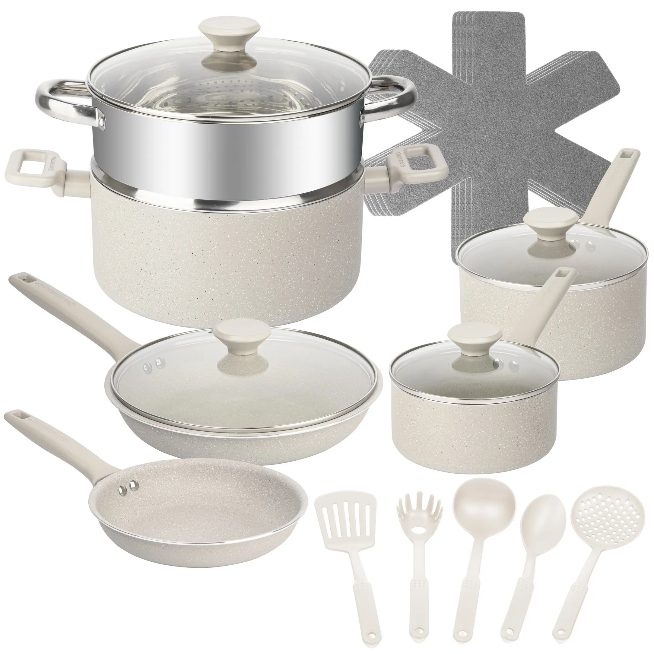 ·20 Piece Essentials Set: 8.5" Frying Pan, 10.25" Frying Pan With Lid, 1.5Qt Sauce Pan With Lid, 2.5Qt Sauce Pan With Lid, 5 Qt Stock Pot With Lid, Steamer, 5 Nylon Utensils Set, 5 Pc Felt Protector
