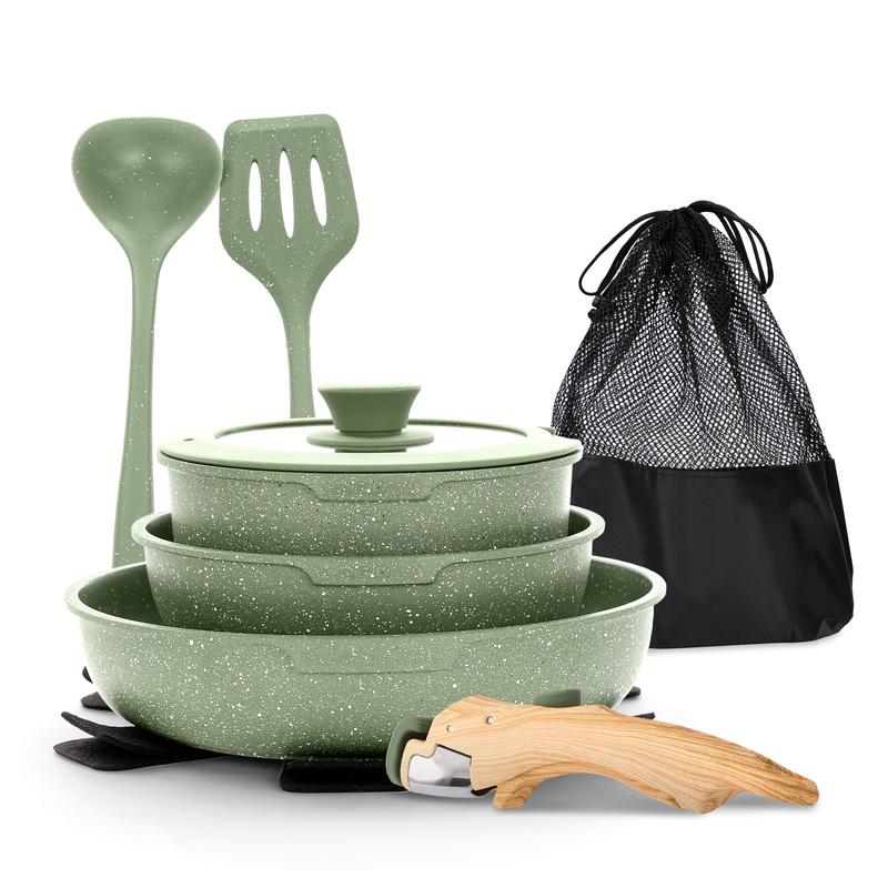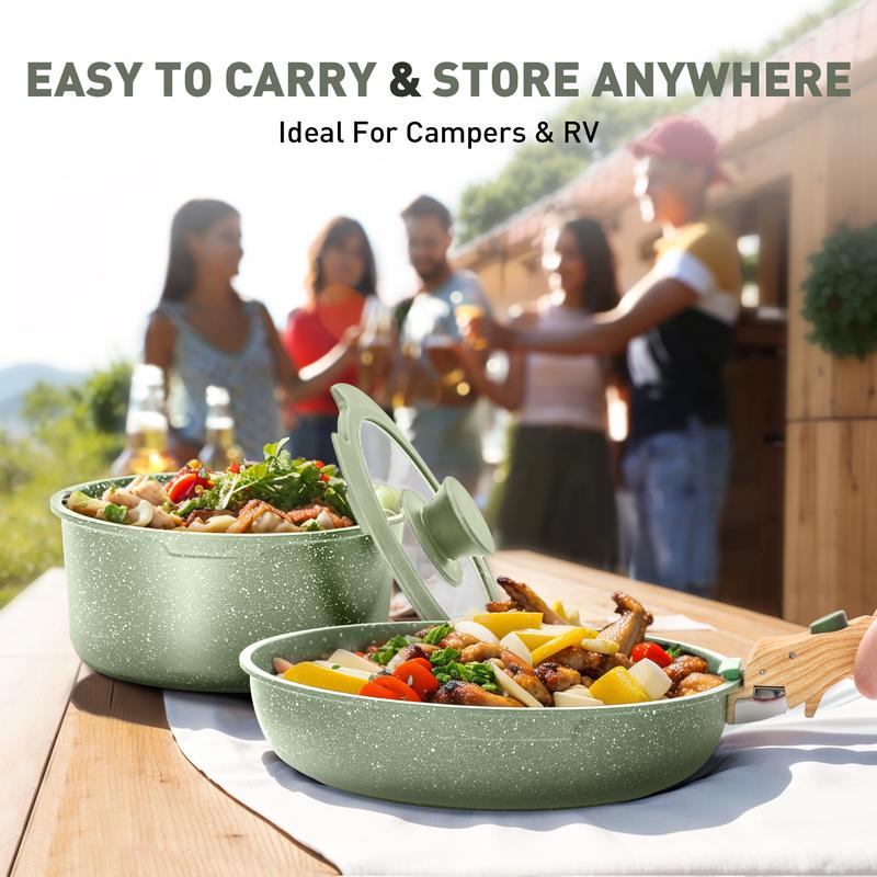 ·Complete Cookware Set: Our pots and pans set includes an 8" fry pan, 10" fry pan, 2 qt saucepan with lid, 2 pcs silicone utensils, 1 detachable handle, 2 pot protectors, and 1 storage bag, making it perfect for RV living and outdoor activities