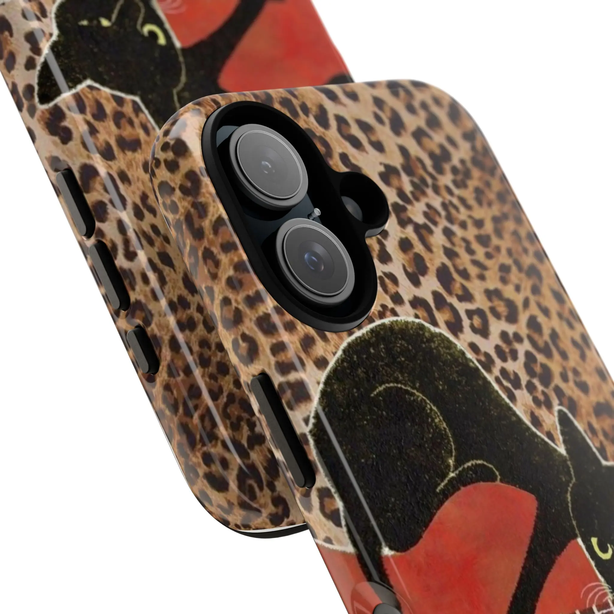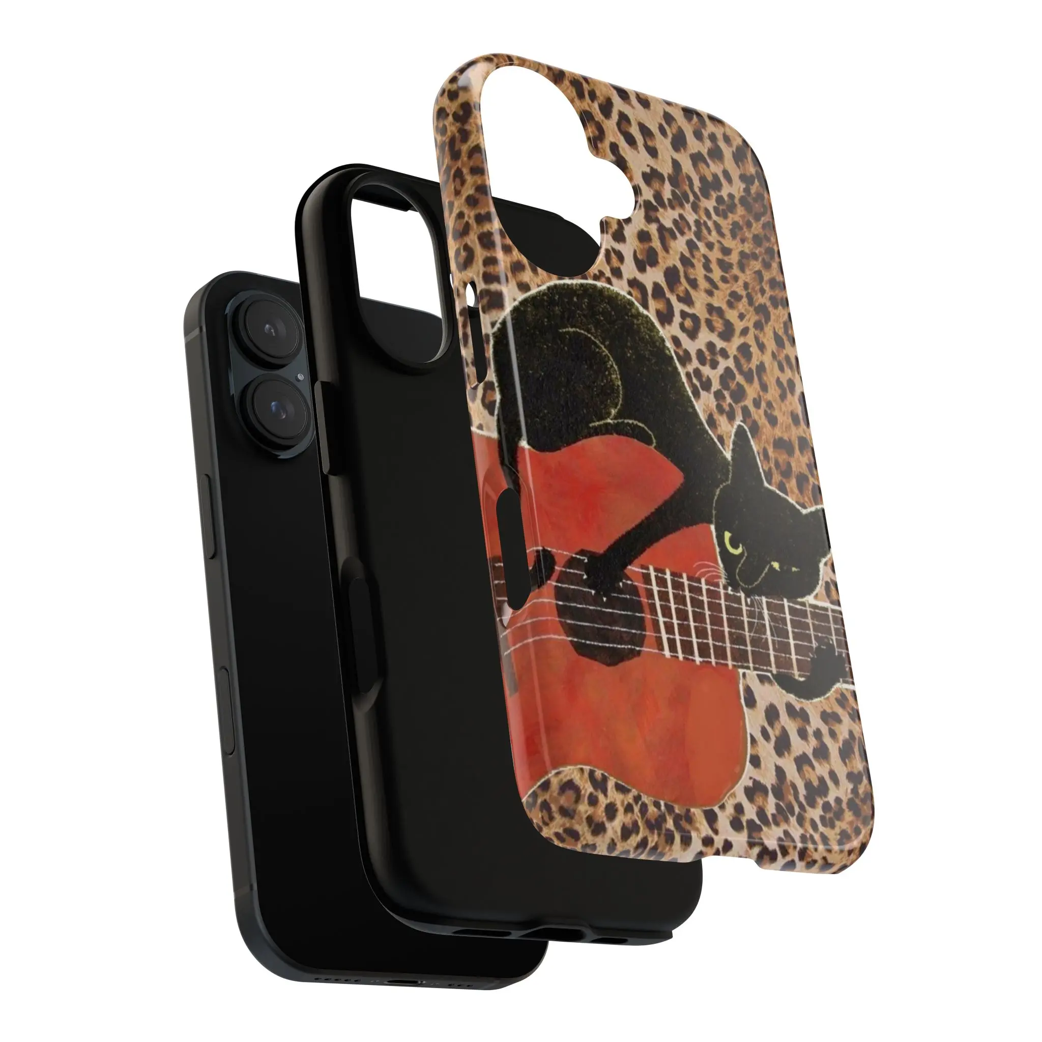 Cool Black Cat with Guitar Tough Phone Case, Stylish Leopard Print Design for Music Lovers, gift for him for her