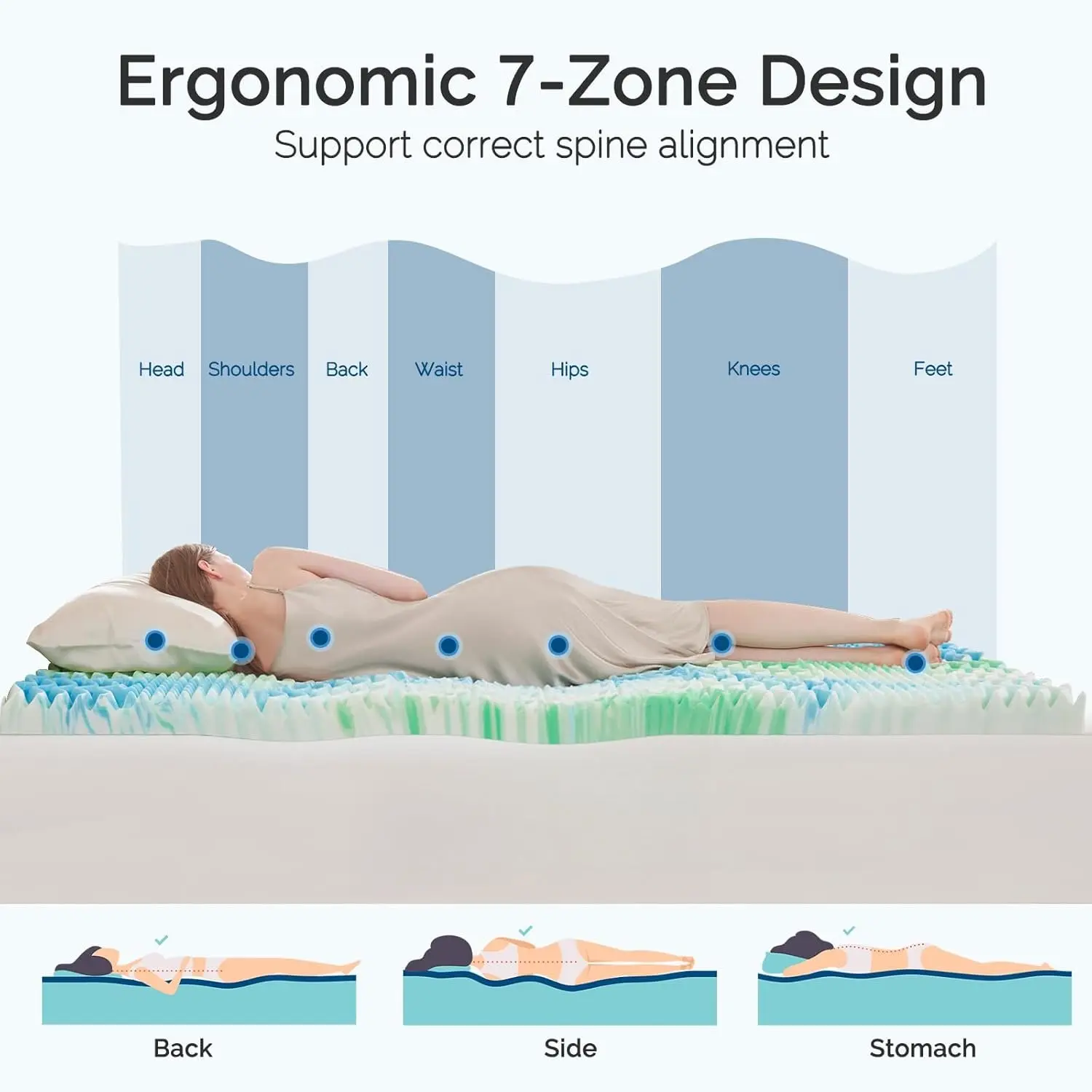 7-Zone Extra Support: Our memory mattress topper features 7 distinct zones to provide customized support for your , , , , , , and . This design alleviates points and ensures proper , making it ideal for reducing . Enjoy a restful night's sleep with 's cooling mattress topper