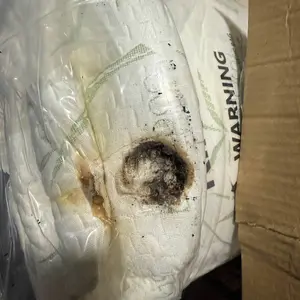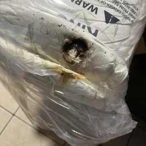 Receive package and it smelled like something was on fire after I opened the package. There was a burnt hole inside the box and it donât burn went through the box into the mattress. Cover will be sending back. They pursued to tape over it so I wouldnât be able to see it, but when I open the box, you can clearly smell that it was on fire, and you can see the evidence of the fire.