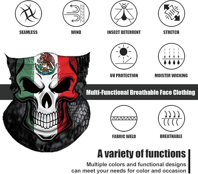 5. Mexican 6pcs Neck Gaiter Face Mask Summer UV Protection Cooling Neck Gaiter Men Women,Seamless Bandana Rave Face Cover Scarf Mask, Balaclava, Headband, Head Wrap, Great for motorcycle, biking, fishing, climbing, Construction work