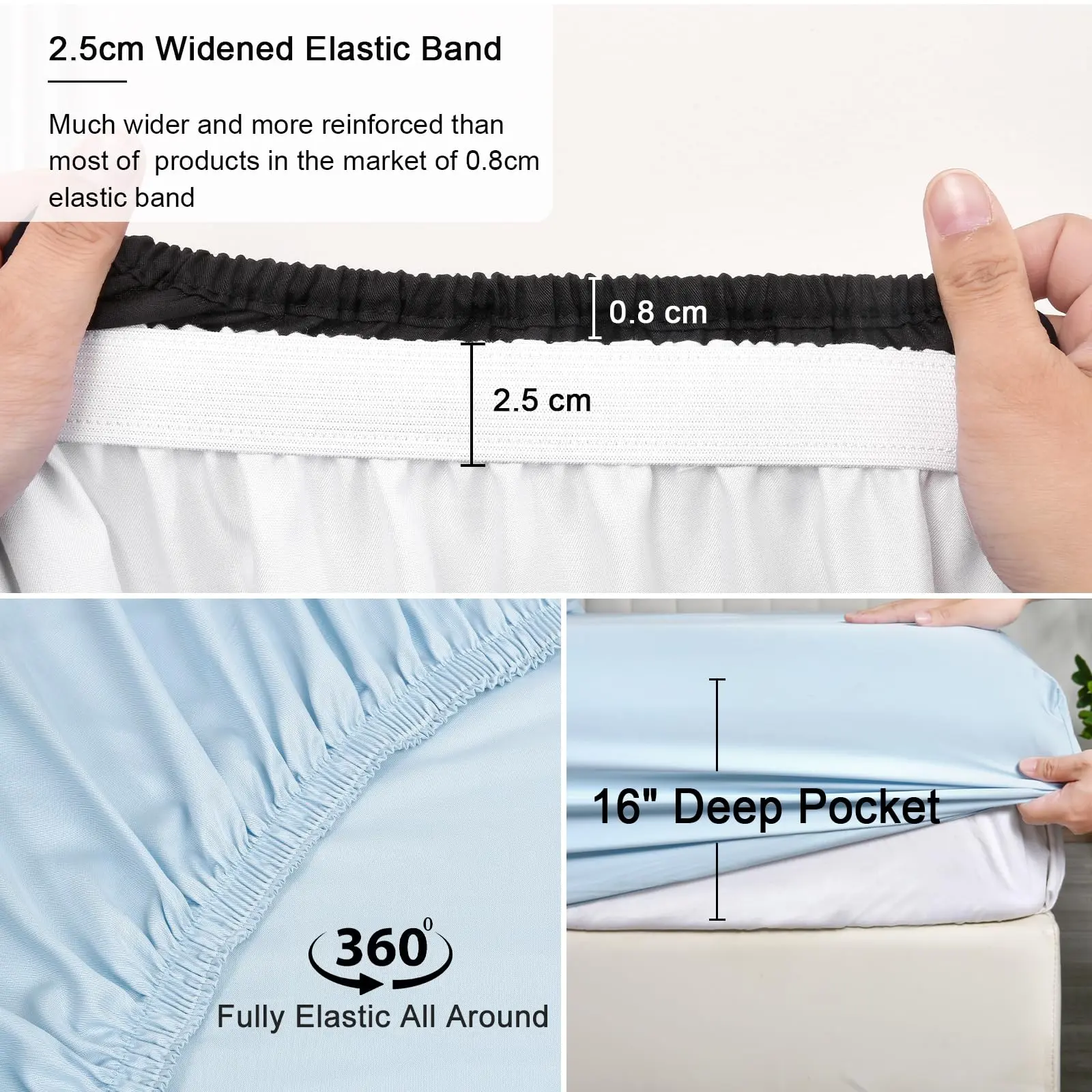 2.5cm Widen Elastic Band & Secure Snug Fit: Our deep pocket fitted sheets are perfect for any mattress type up to 18 inches. And its deep pocket can cling to the mattress like a glove. With a full and Widen reinforced elastic band at the backside, it will safely and securely cover your mattress, our fitted sheet has increased the elastic width from the usual 0.8cm to 2.5cm to make it easier to take on, and never slide no matter how you twist and turn in your bed.