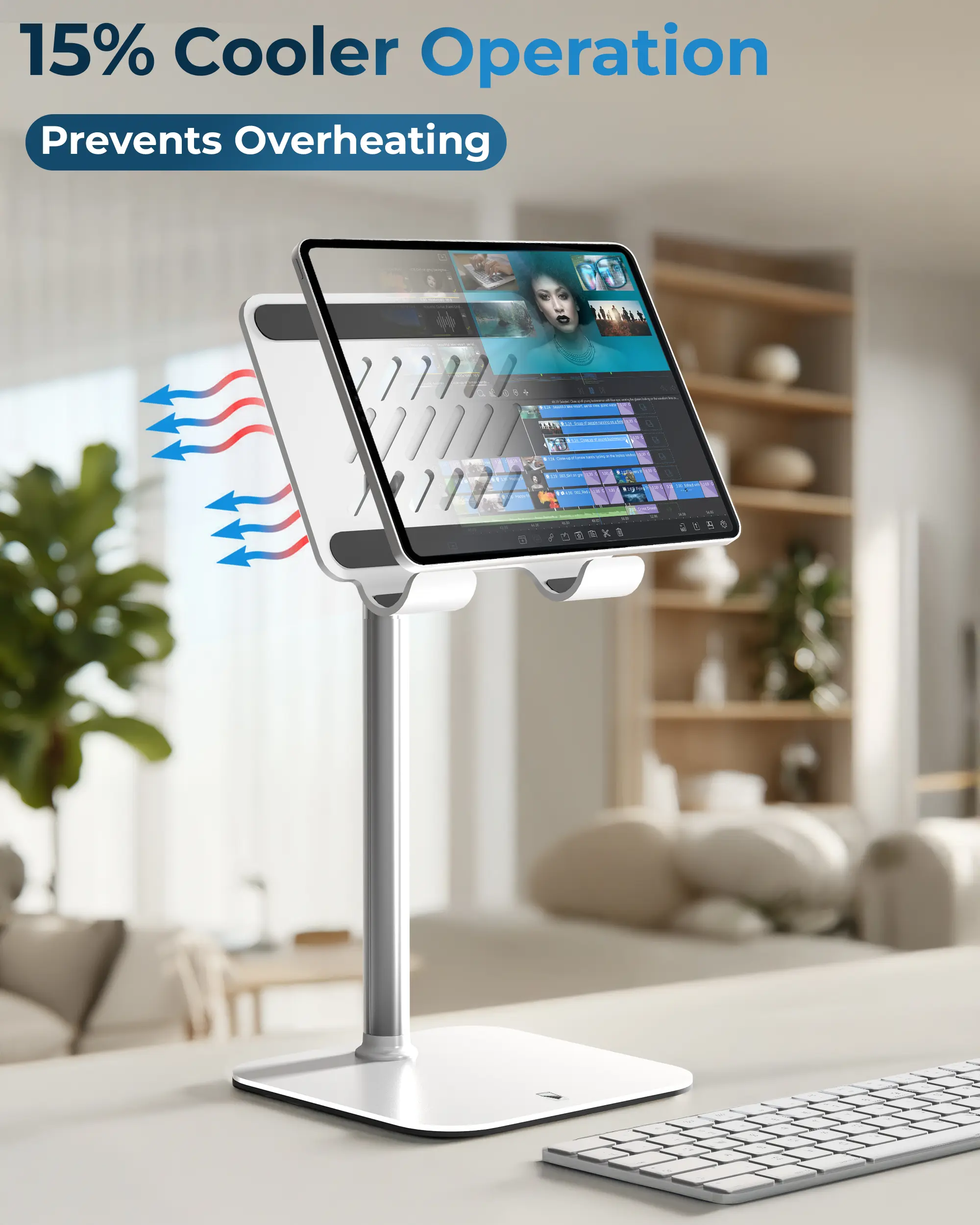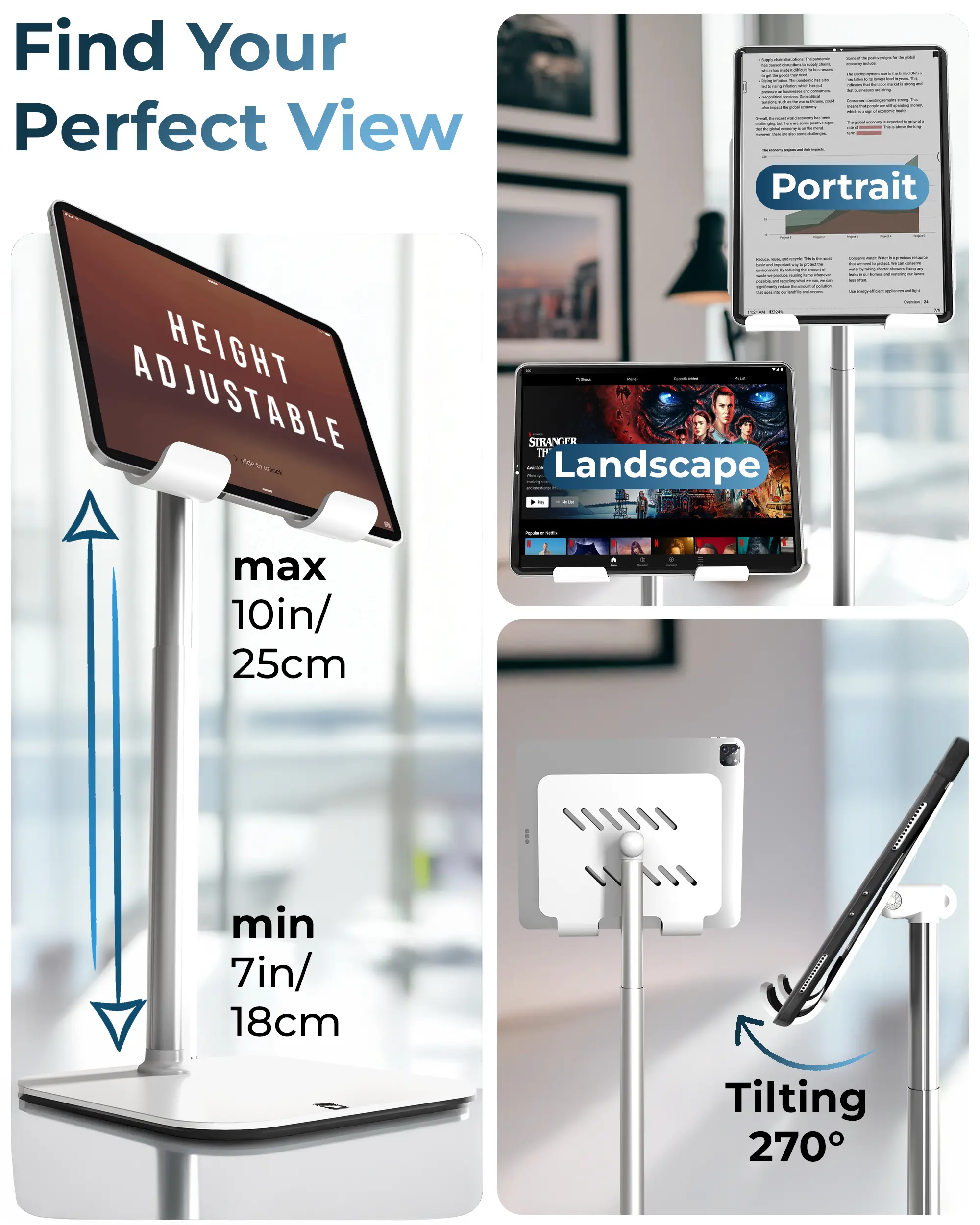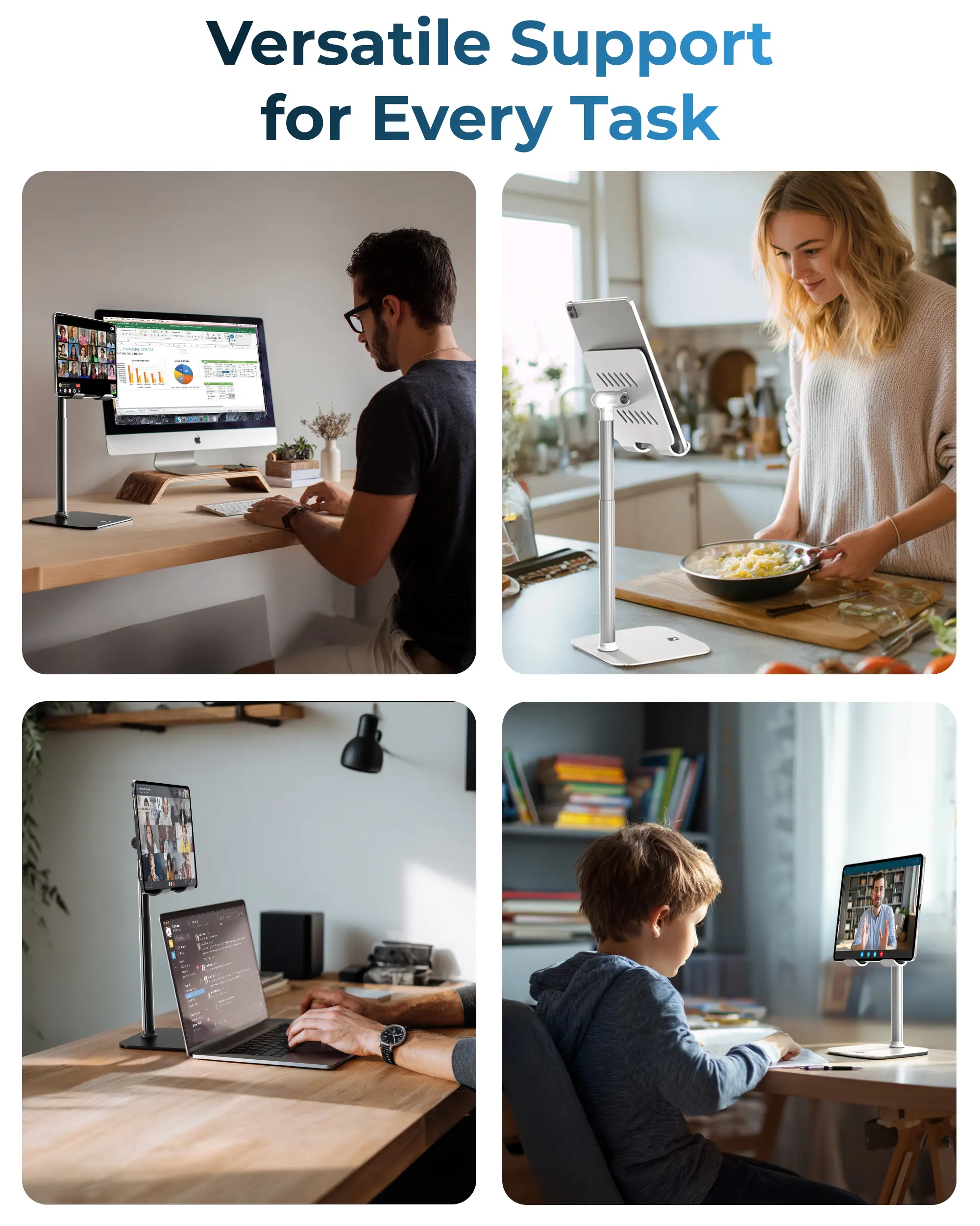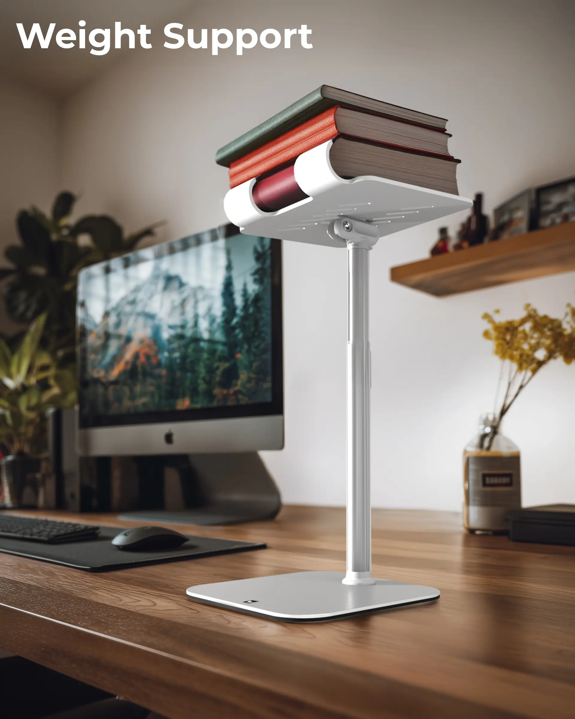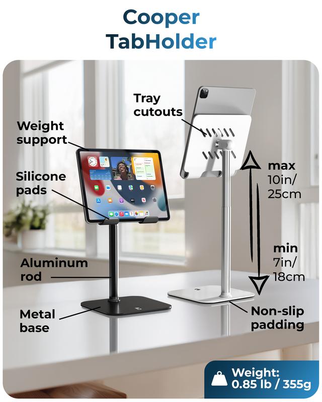 Engineered with a triple stability design, this tablet stand for desk combines a weighted metal base, EVA non-slip padding, and a 40% wider holding plate. Perfect for steady performance on any surface, from your office desk accessories setup to your bedside table.