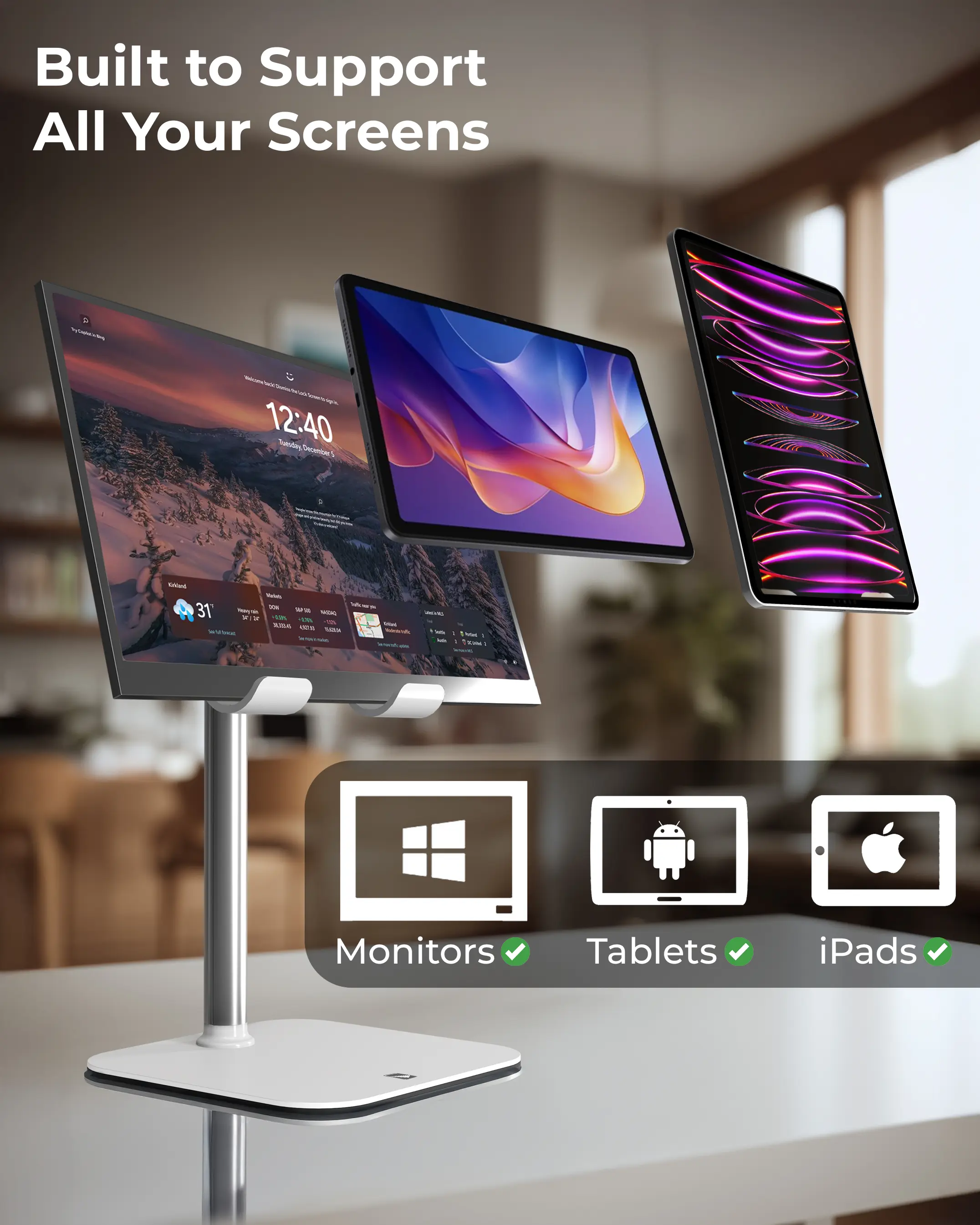 Yes! Our iPad holder stand fits all tablet devices, from iPad Pro 12.9, Samsung Galaxy Tab, Kindle Oasis, to portable monitors (15.6–17"). It’s the go-to iPad accessories choice for multitaskers, content creators, remote workers and professionals alike.