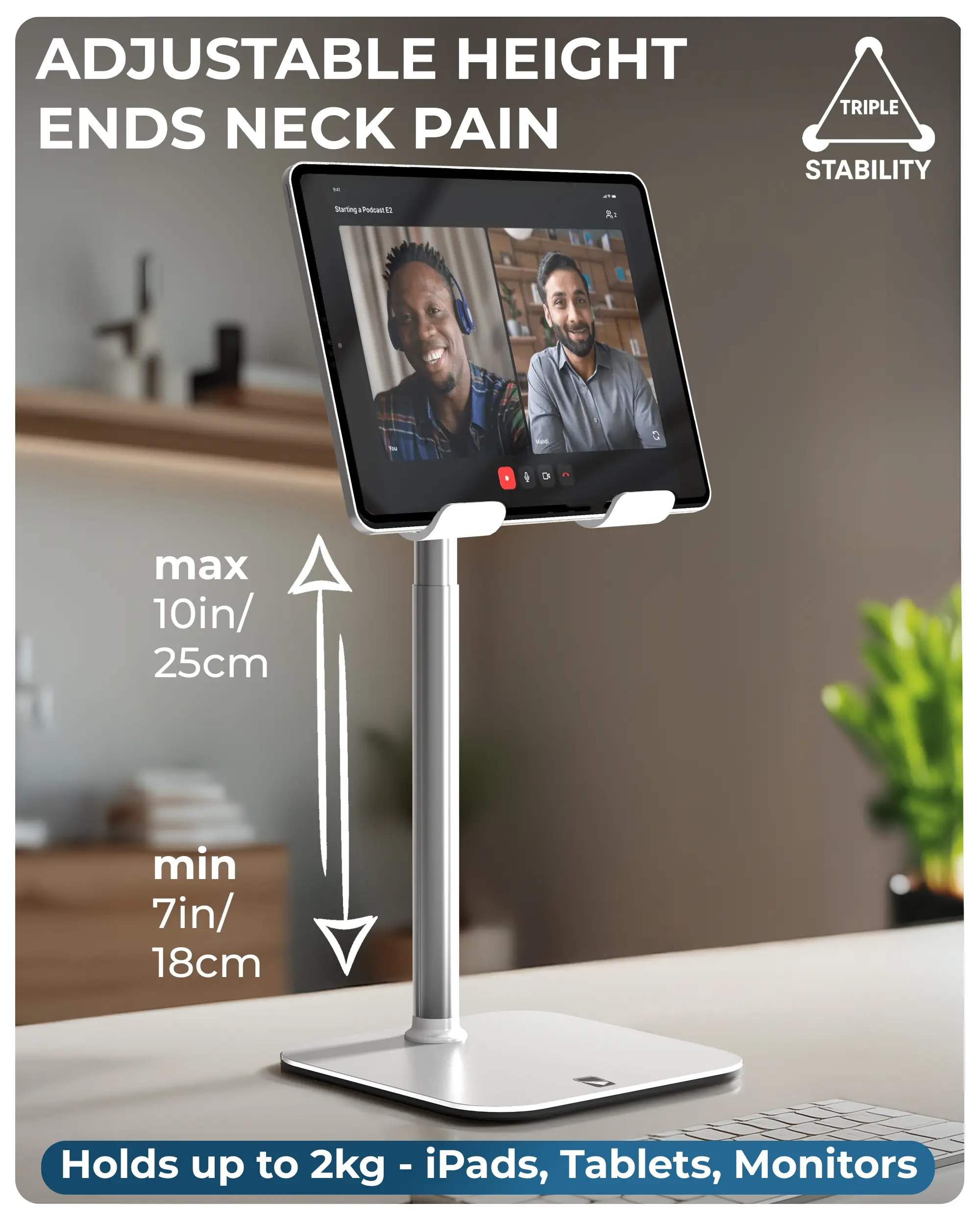 This height-adjustable iPad stand extends 7–10" to bring your screen to eye level for comfortable all-day work. It supports devices up to 2kg, making it one of the most reliable iPad accessories and desk accessories for any setup.