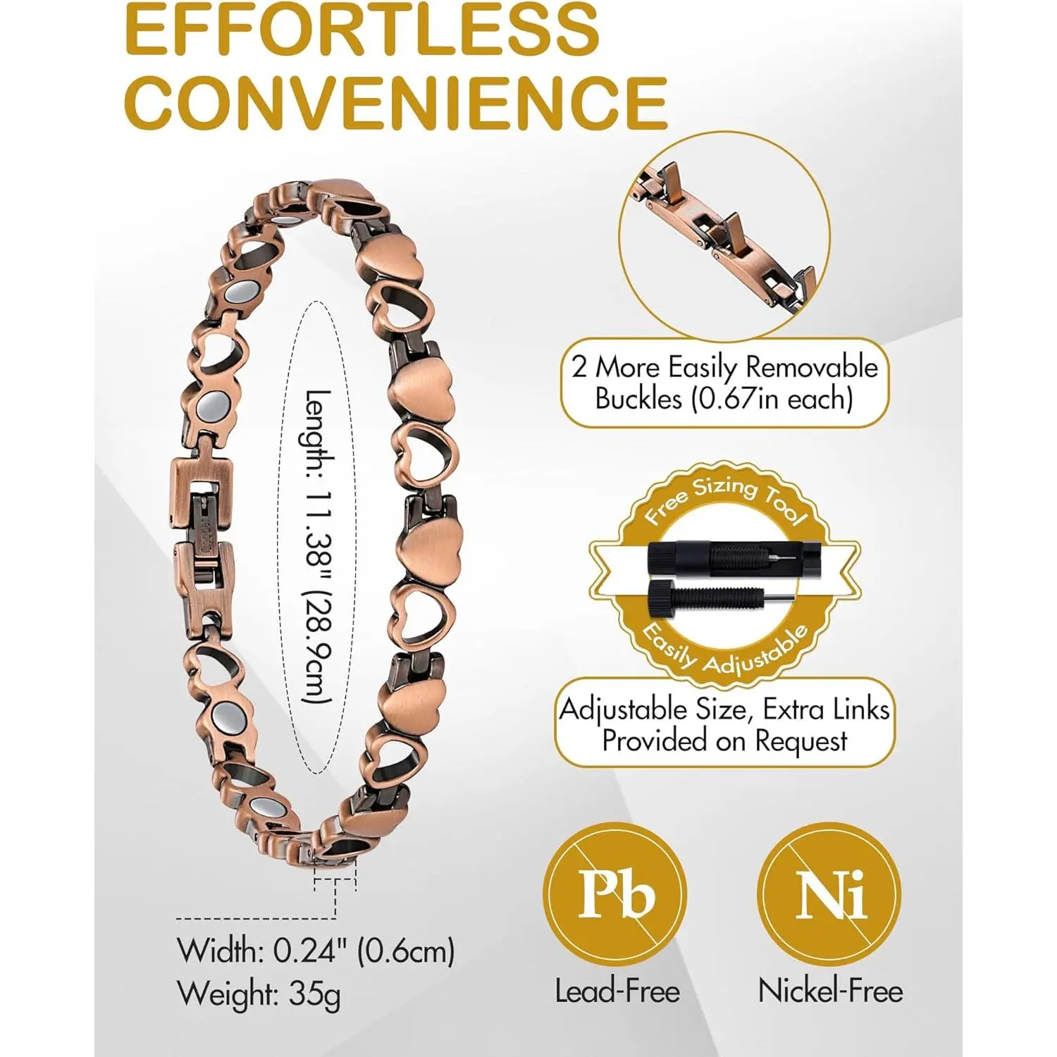 I been wanting a copper anklet and being a plus size girl I couldn’t find one and this one fits perfect and it came with 2 additional adjustments and I was able to remove one easily. Looks so beautiful 10/10