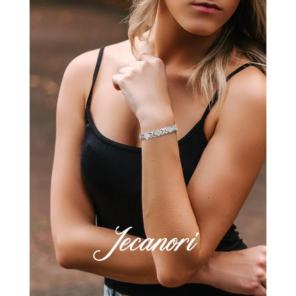 This bracelet is beautiful! I got it in silver. The shine that comes from this bracelet is amazing! Very comfortable and very easy to size. I appreciate the tools it came with so I could make it smaller. I've received several compliments so far. I'm so glad I took a chance and purchased the bracelet!!