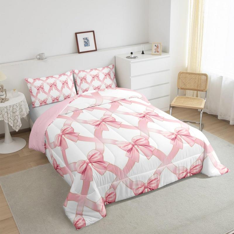 Coquette Bows Comforter Set,Golden Pink White Bows Comforter,Watercolor Bow Bedding Set,Cute Bowknot Duvet Set,Room Decor Bedroom Home Decor Quilt Set