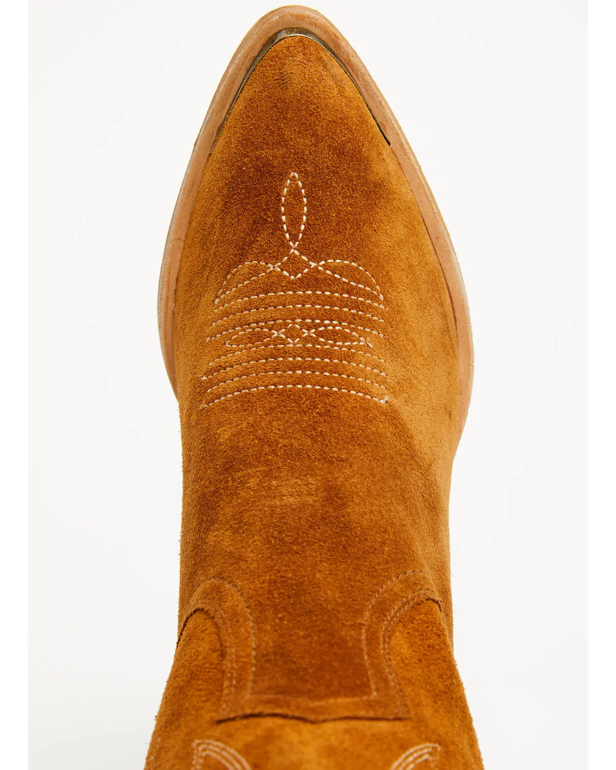 Suede upper. Leather outsole with rubber heel cap. Pull-on style with pull tabs. Zipper closure on interior. Round toe with metal rand. 22" shaft height. 3" western heel. Leather outlay details on heel and shaft. Solid brown design with western stitching. Handcrafted by highly skilled boot artisans.
