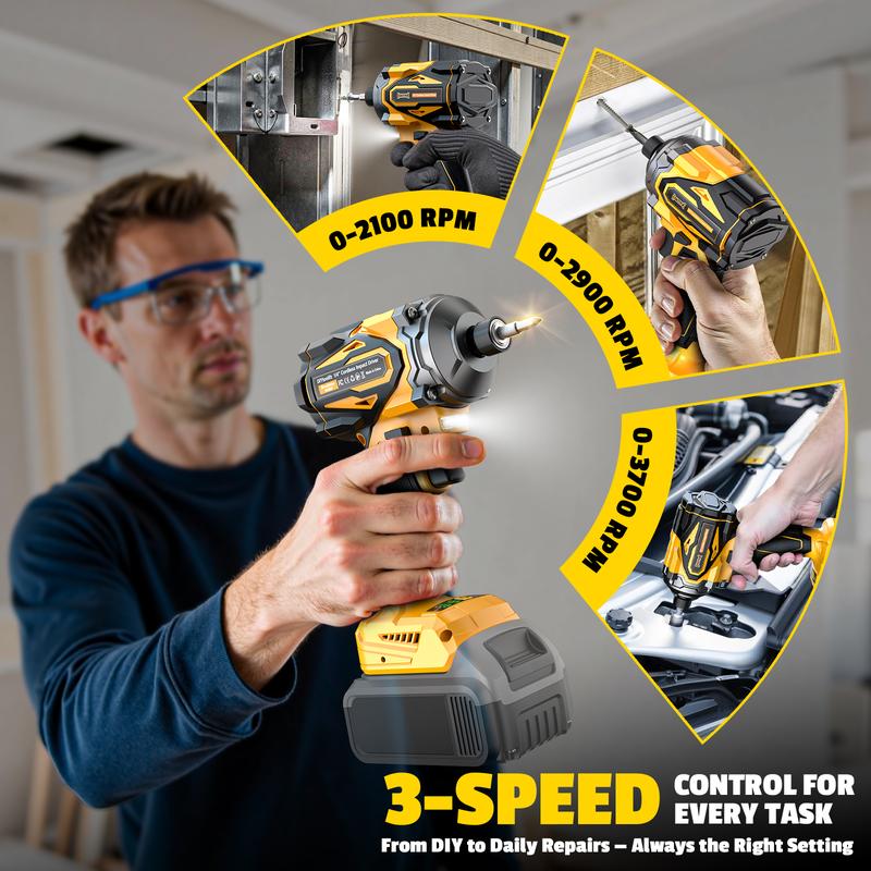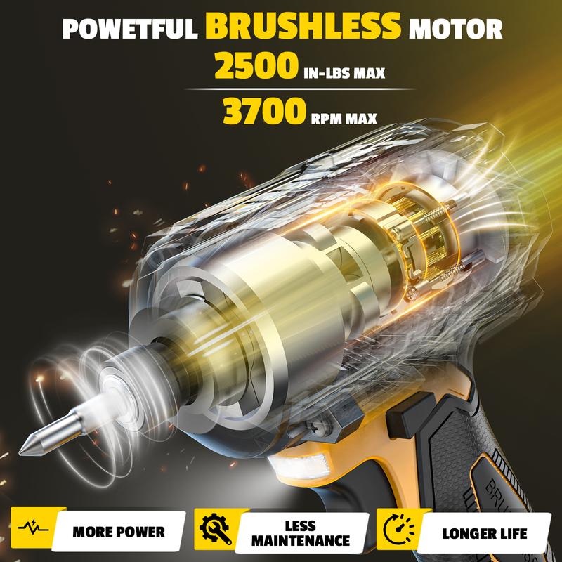 ·Brushless Motor for Longer Life & Runtime: The portable impact driver is equipped with a high-efficiency brushless motor that runs cooler and lasts longer than brushed models. It’s the go-to choice for pros and DIYers who need a reliable cordless impact drill for long workdays with less maintenance.