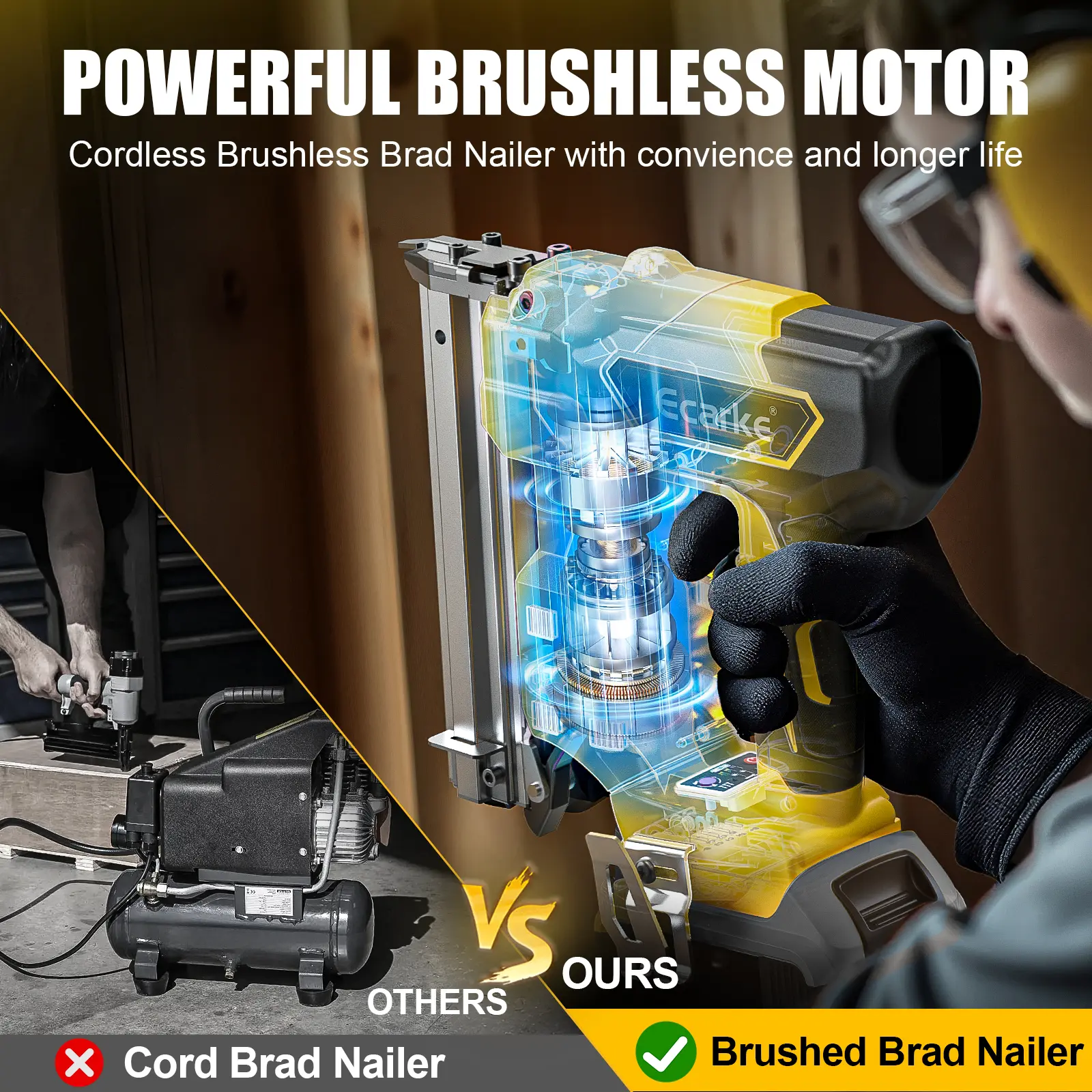 【Brushless Brad Nailers】 - Utilizes a brushless motor for maximized runtime and durability. Equipped with overload, overheat, and low power protection, ensuring reliable firing power across diverse materials and climate conditions