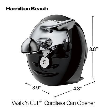 Walk 'n Cut Cordless Can Opener The Hamilton Beach Walk 'n Cut Can Opener is cordless and rechargeable. Once charged, you can take it to the tabletop, camping, or anywhere you need to open cans without worrying about a cord or having an electrical outlet nearby. It opens cans hands-free by moving itself along the lid while cutting and then automatically shuts off when finished. The action lever with cutting blade assembly detaches for easy cleaning, and a strong magnet holds the lid up out of your food after you've opened the can to reduce mess. It's brought to you by America's #1 brand in can openers. What You Get Cordless Can Opener