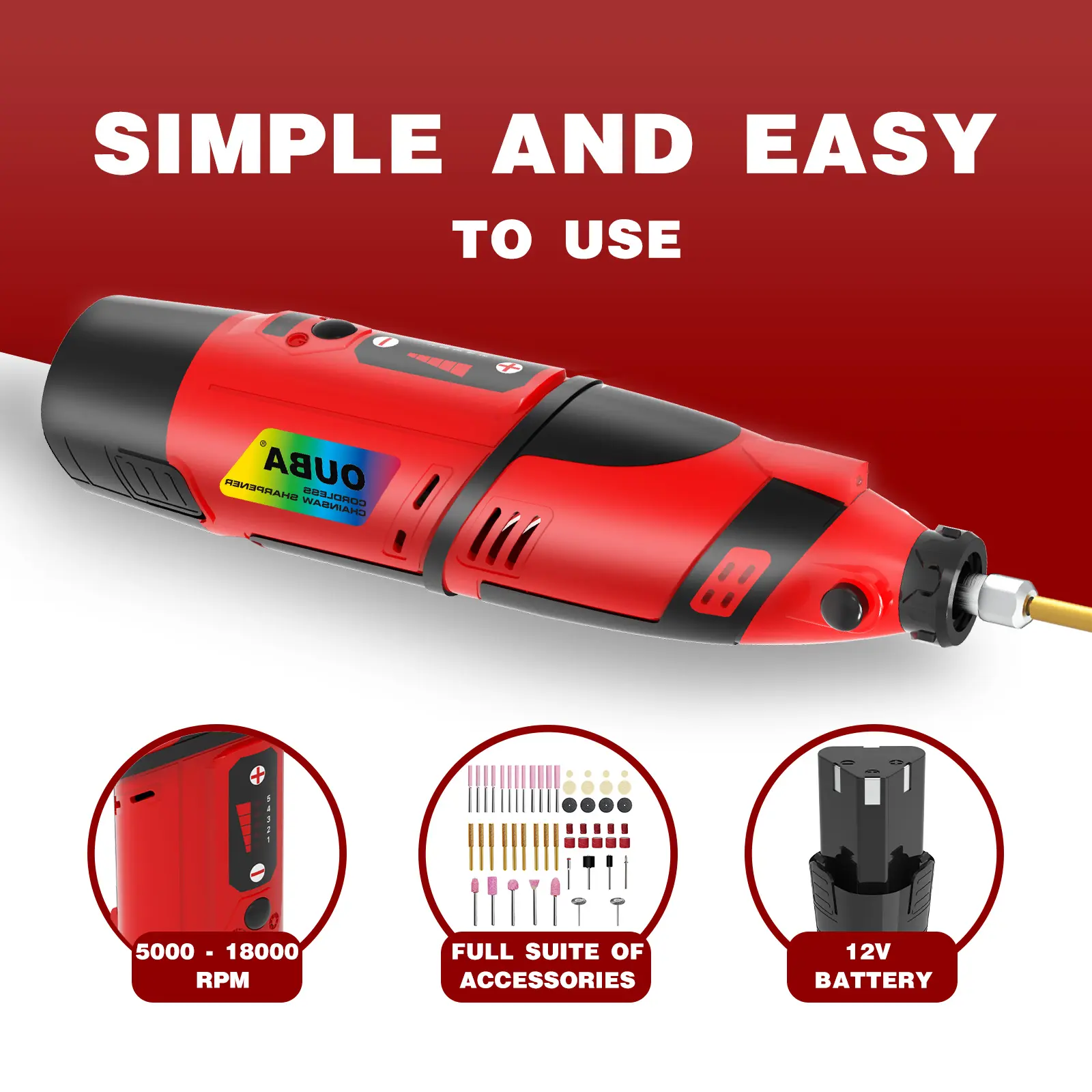 3.Upgrade your toolkit with the OUBA Cordless Chain Grinder! Equipped with a 2000mAh battery, it delivers powerful performance without the hassle of tangled cables. Perfect for precision grinding and easy to carry wherever you go.