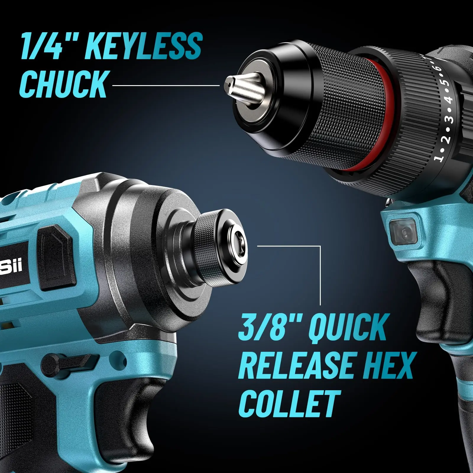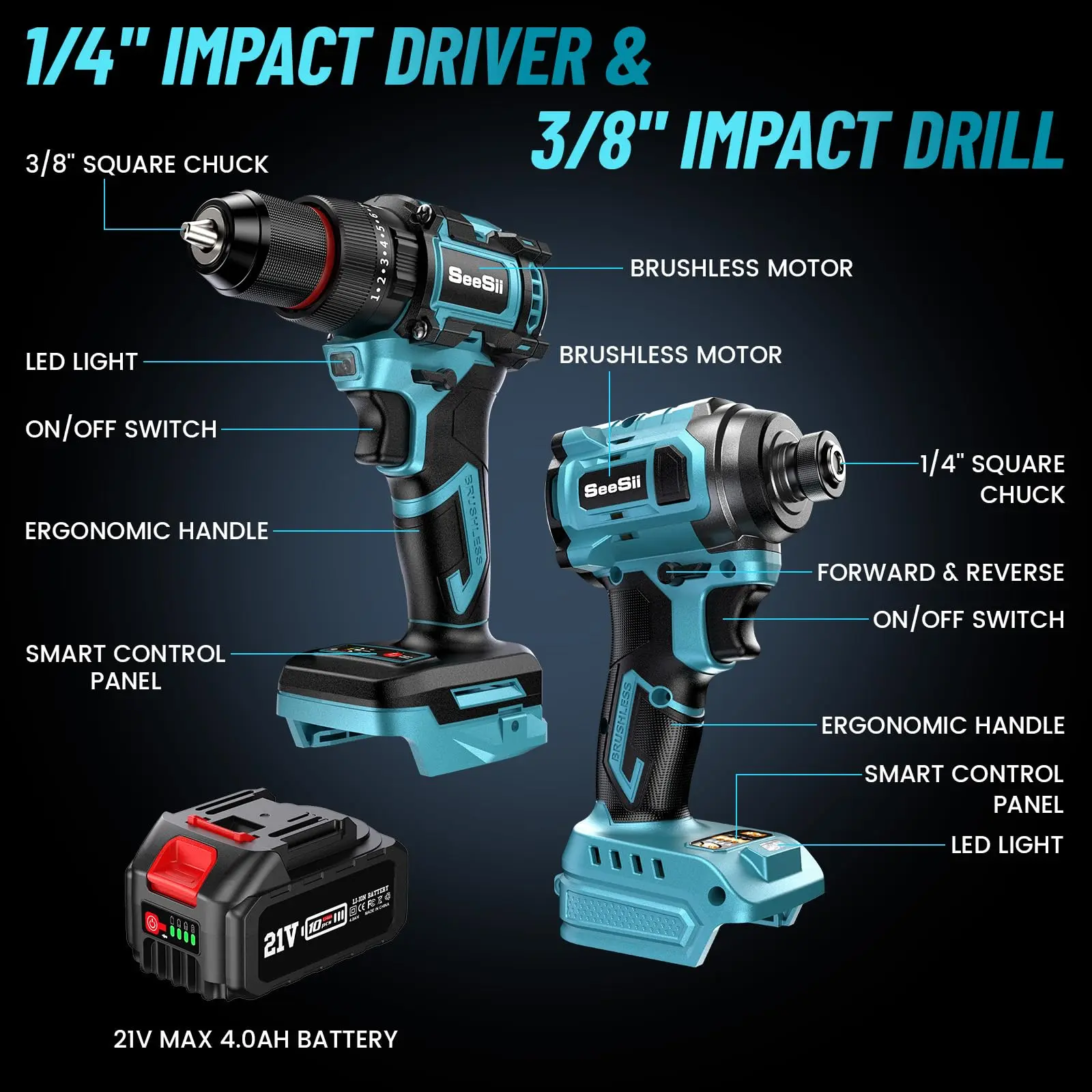 Seesii 3/8'' Brushless Cordless Drill and 1/4'' Impact Driver Combo Kit