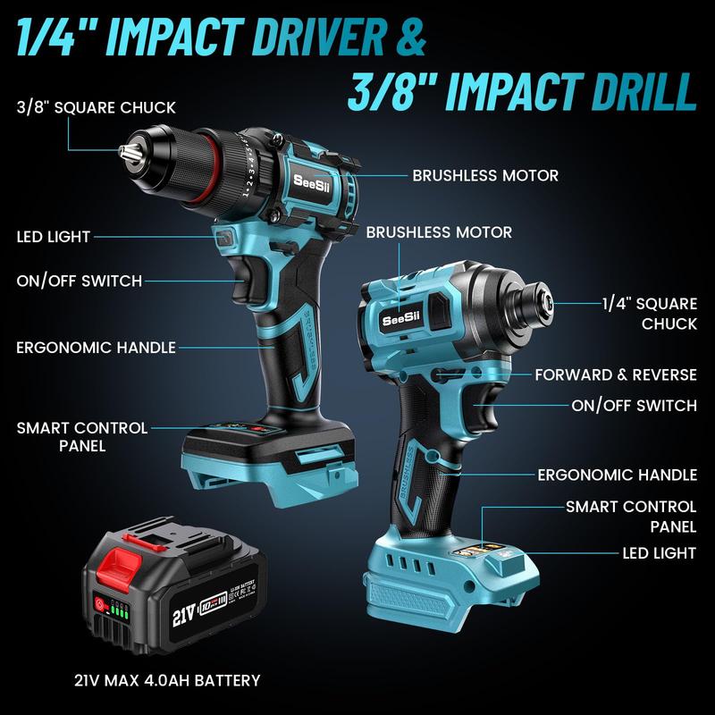 The Seesii 3/8'' Brushless Cordless Drill and 1/4'' Impact Driver Combo Kit is a powerful and versatile tool set, perfect for various home tasks. The included features and compact design make it a great choice for anyone looking for a reliable power tool set.