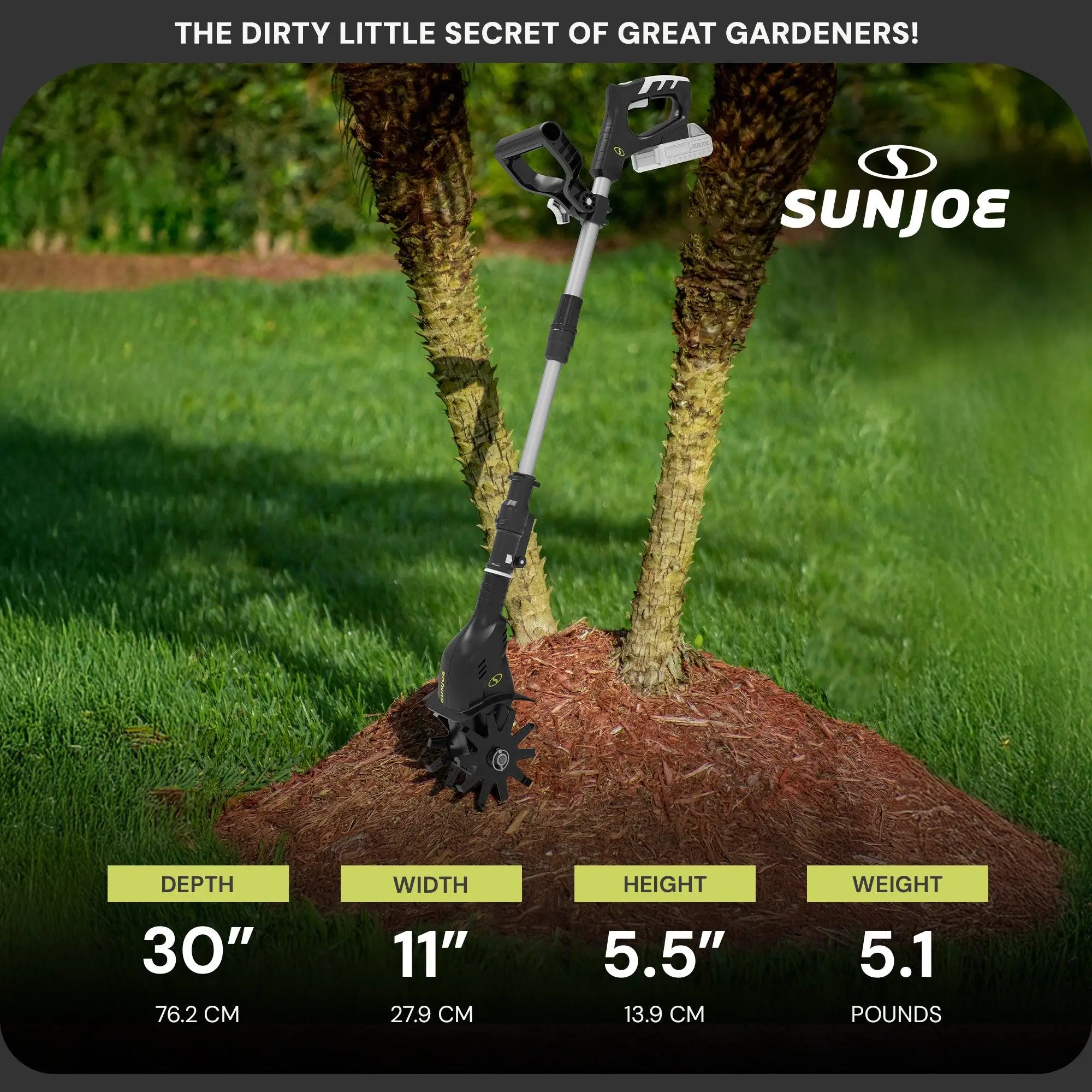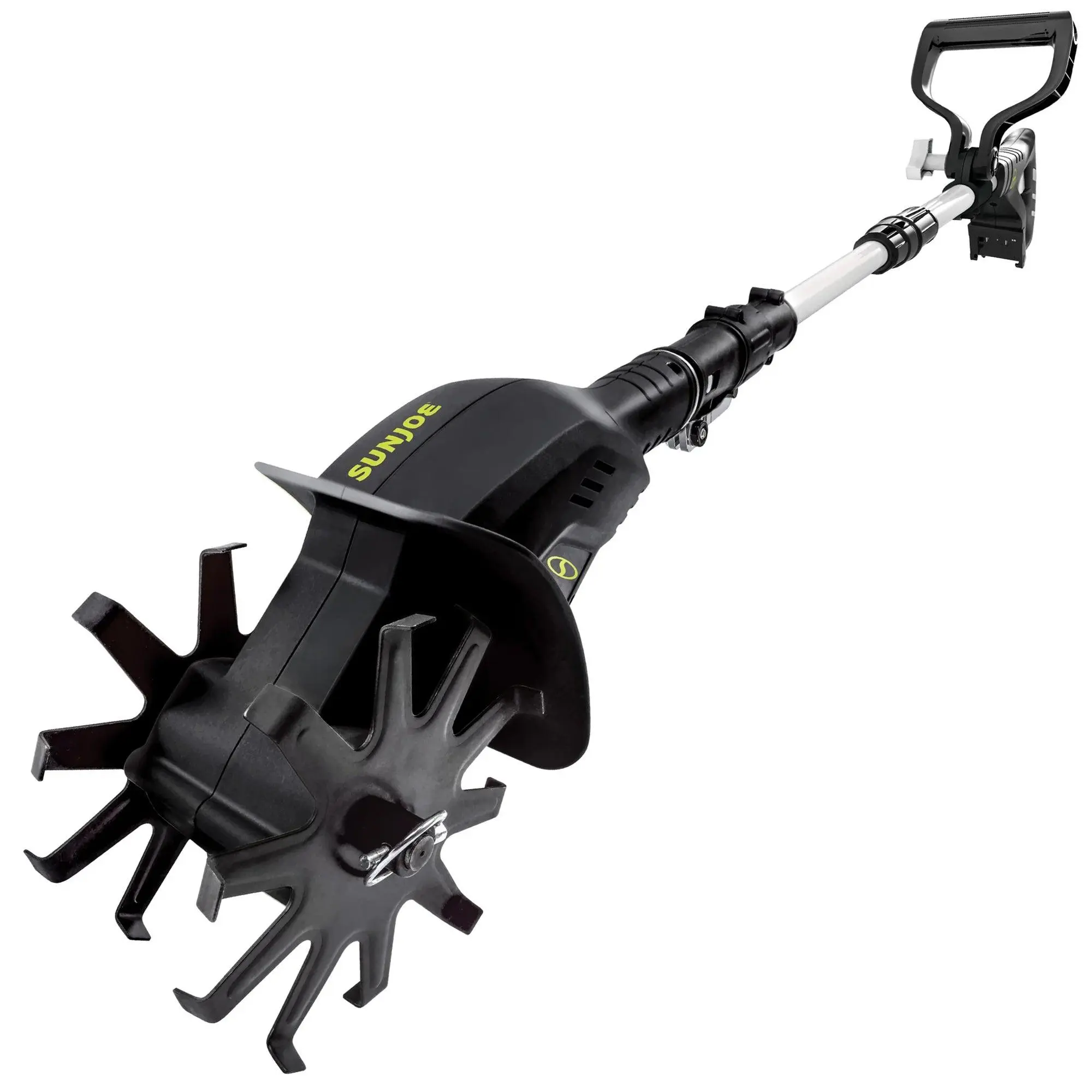 The Sun Joe 24V Cordless Garden Tiller + Cultivator puts the power of a traditional tiller in a lightweight, compact, and cordless design—perfect for small garden beds and tight spaces. Say goodbye to back-breaking yard work and hello to effortless soil cultivation!Sun Joe's exclusive, eco-friendly 24-Volt lithium-ion battery system (battery and charger sold separately) powers this tiller and delivers up to 30 minutes of rechargeable runtime with any compatible 24V battery. Go where larger machines can’t with the dual 6-inch steel tilling blades that cultivate a 4.25-inch wide by 6-inch deep path in one smooth pass for quick and effortless gardening. The 10 durable steel prongs effortlessly slice through weeds and loosen soil to help air and moisture reach roots for healthier plants.Designed with your comfort in mind, this lightweight tool weighs just 7.6 pounds and features a telescopic pole that extends from 28.3” to 37.3” for the perfect reach. The ergonomic auxiliary handle further reduces fatigue, so you can work longer with less effort.Whether you're prepping garden beds, weeding, or aerating compact soil, the Sun Joe 24V Cordless Tiller is your go-to tool for fast, efficient yard care. Compatible with the entire 24V tool family, it’s a smart, sustainable solution for every gardener.