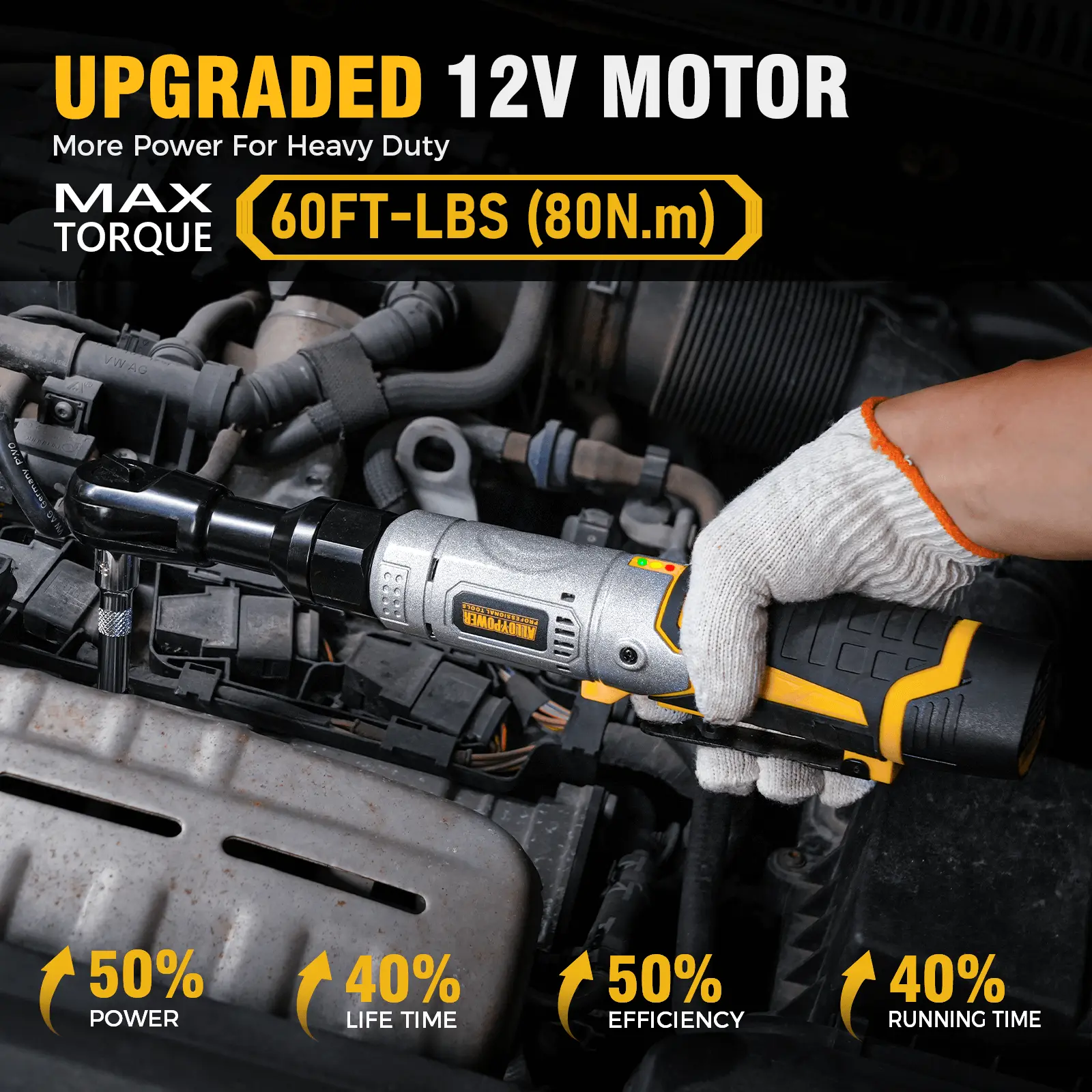 ·【HIGH TORQUE FOR HEAVY DUTY WORK】Extended electric wrench ratchet has torque up to 60 ft-lbs (80 Nm) to remove or install most nuts. Upgraded to a steel alloy body structure, the head bearing is also made of thicker steel than on the market to prevent steel balls from falling or bearing damage or body breakage!