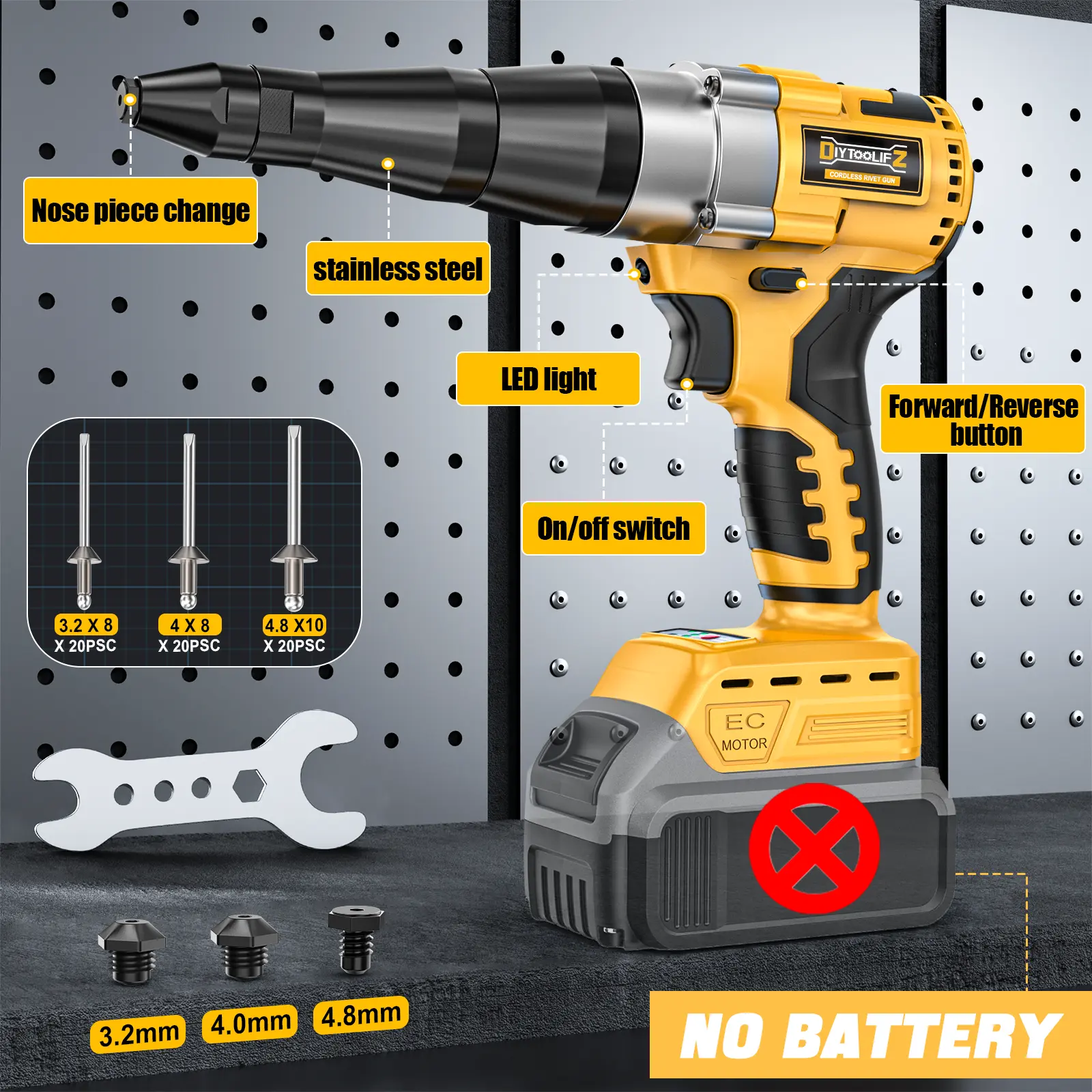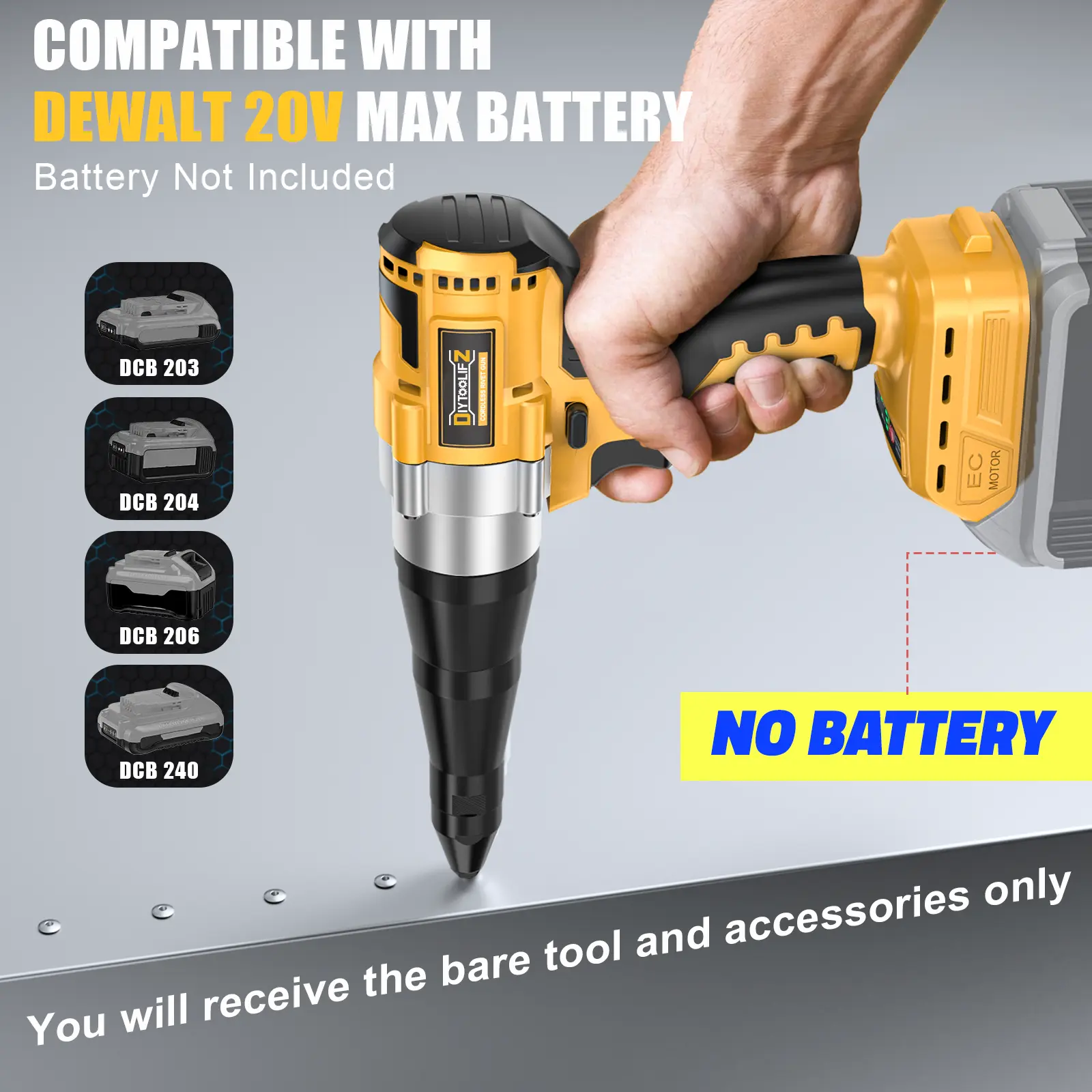 ·Cordless Convenience: Enjoy the ultimate freedom with our cordless rivet gun, Compatible with Dewalt 20V battery (NO BATTERY = No incluye batería). This pop rivet gun offers unmatched portability, allowing you to tackle your projects with unrestricted movement,eliminates tangled cords while deliveringprofessional-grade performance for autorepair, metal fabrication, and DlY projects