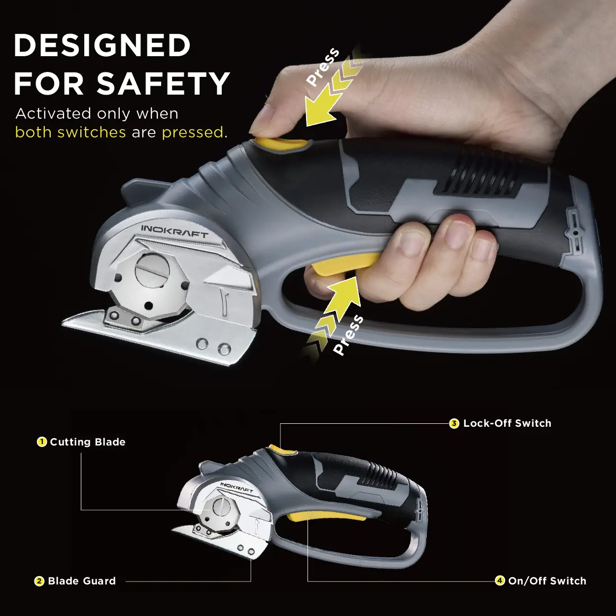Stay safe with the dual-button operation, requiring two buttons to be pressed simultaneously to start. The protective blade guard further prevents accidental cuts, ensuring complete safety during use.