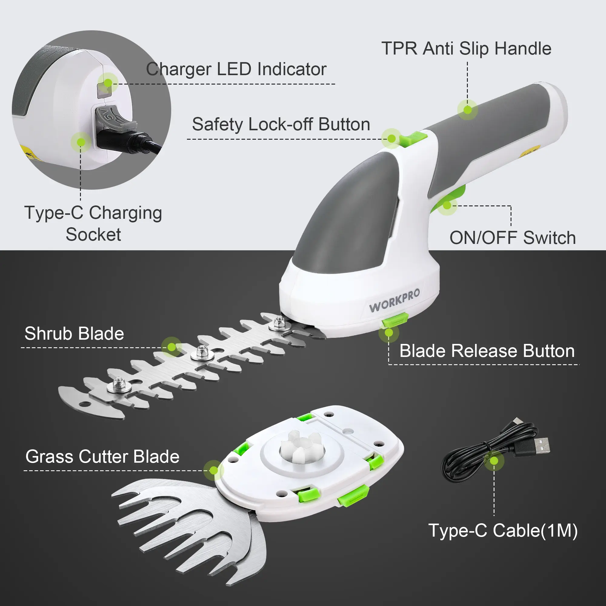 ·Better Cutting Ability: The cordless grass cutter is equipped with sharp blades (5.9'' long shrub shear and 4.17'' wide grass shear), providing perfect trimming effects for lawn, hedge, or garden edges, dead perennial plants, cleaning small shrubs and twigs in the yard. The hedge trim blades are best suited for less than 7.95 mm thick branches. Moreover, blade replacements are simple, fast, without any tools, safe, and convenient
