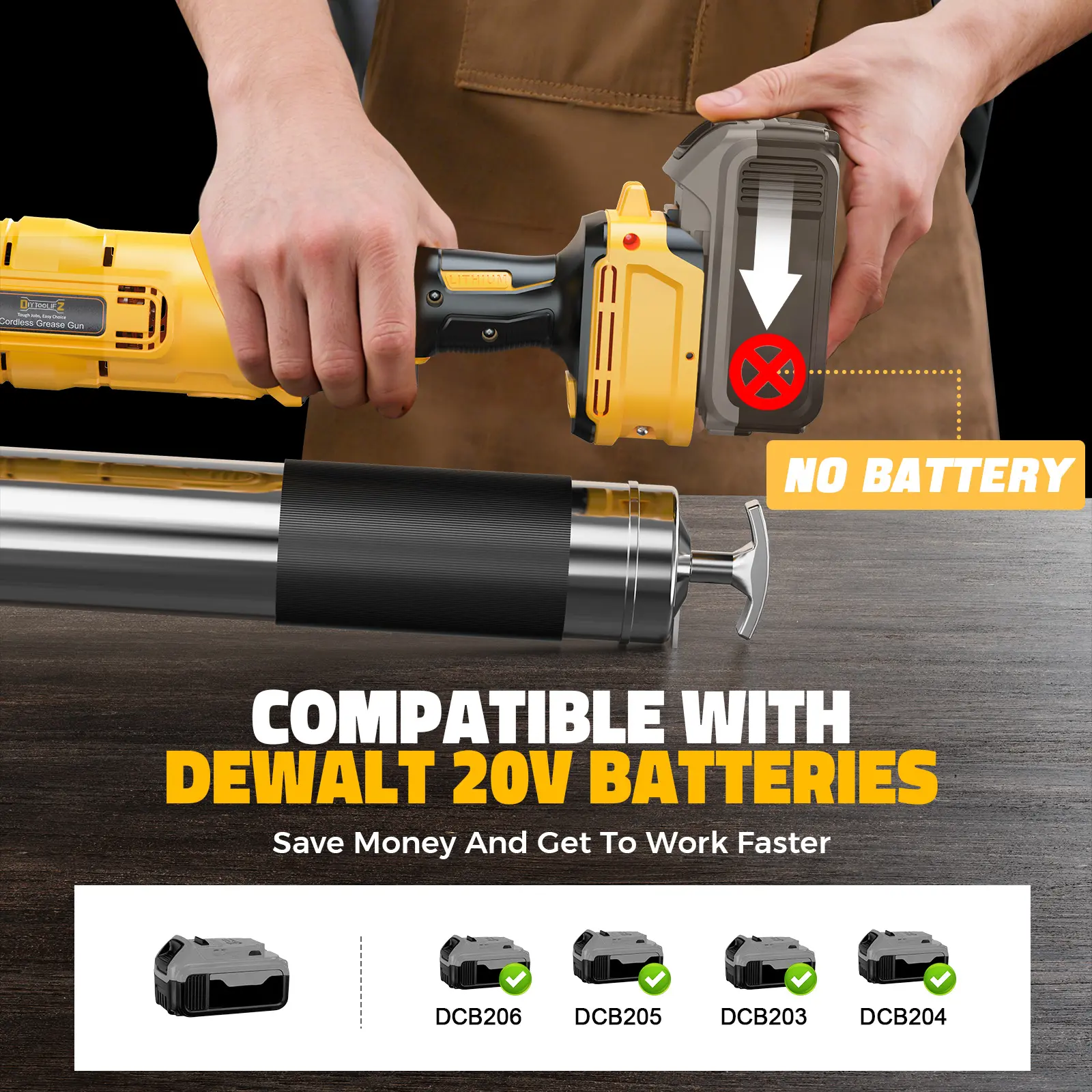 ·Cordless Freedom – This cordless grease gun is compatible with DeWalt 20V batteries (Battery & charger NOT included!!). No extra batteries needed—just use the ones you already own.