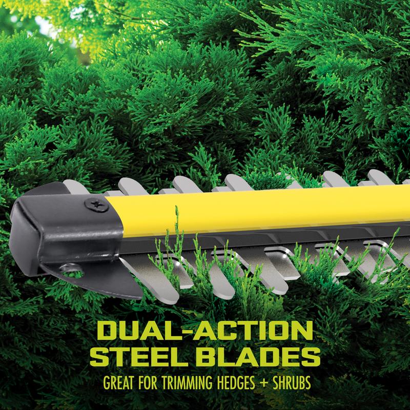 Trim, hedge, edge, and clean up your overgrown bushes; the robust 250 Watt motor and dual-action blades provide up to 40% less vibration than traditional, single-action machines. IONMAX will quickly become your go-to tool to shear cleanly through shapeless shrubs. The 18-inch, rust-resistant blades cut through branches, twigs, and stems up to 0.55 inches thick — for a perfectly groomed hedge every time. And with user-friendly features like the dual-handed grip, built-in safety switch to prevent accidental starting, and front hand guard to protect against blade contact, SUN JOE makes cutting down your landscaping to-do list easier and safer than ever.