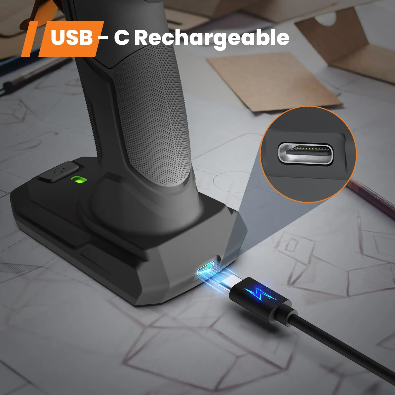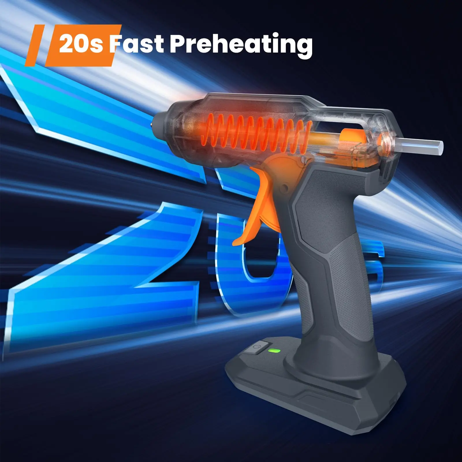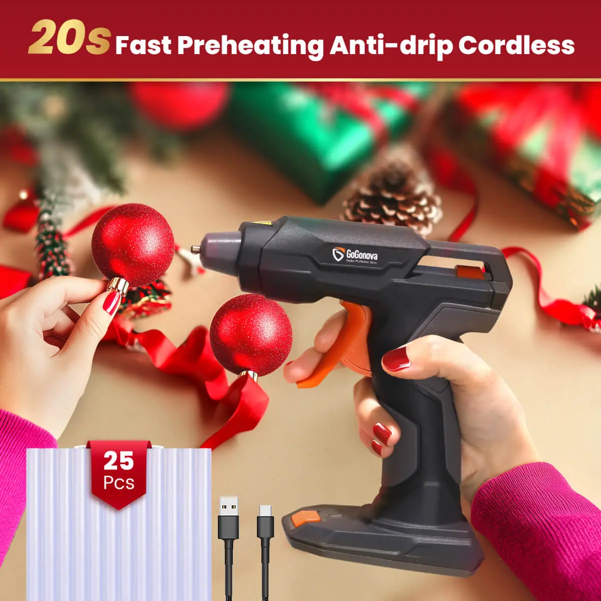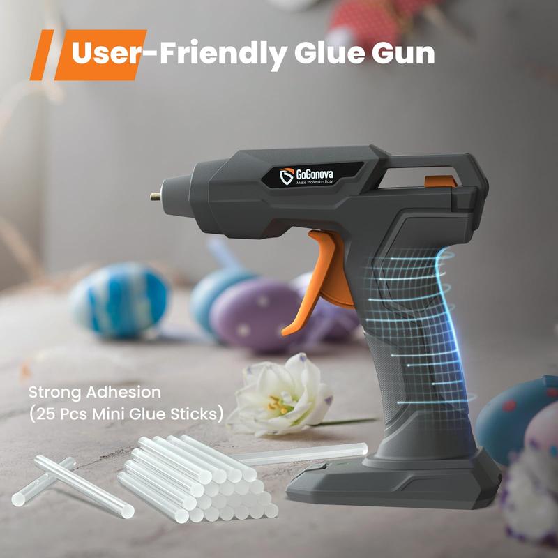 ·20s Fast Preheating & Cordless Design - Preheating Faster! Only 20s heating time to work! 5 times faster than ordinary adhesive gun, greatly shorten your waiting time. Work Anywhere! No extension cords getting tangled up, limiting range of use, and works wherever you need it, long distance crafting, high place, even the outdoor working, it will be your great partner.Anti - drip & Adhering Smoothly - The innovative dispensing system of this hot adhesive gun greatly reduces the dripping, saves more adhesive sticks and keeps your workbench cleaning. Ensureing the adhesive discharge smoothly without any mess, providing precise application for your projects. Make your crafting work easier.Type - C Rechargeable & Ergonomic - Charging Anywhere! This cordless hot adhesive gun adopts a Type - C port, compatible with your electronic products Type - C cable, such as the laptop/PC, phone, more convenient for you. Suitable with 5V 2A charger. The ergonomic handle let your crafting more comfortable. Please Charge with the Type - C Cabel Contained In the Adhesive Gun Kit.5mins Auto Power - Off Protection - Special design for you! The adhesive gun will turn off after 5mins not using automatically. Protects your safety and saves energy.Versatile Applications - Got plenty of handmade to make? This hot melt adhesive gun can apply molten adhesive to almost any material, such as plastic, fabric, cloth, wood, glass, metal, etc. Whether you're working on packaging, handmade projects, handmade repairs, or decorations, this adhesive gun is a versatile tool that can handle various tasks with ease.25 Pcs Premium Mini Adhesive Sticks - Additional 25 pcs strong adhesive and high purity mini adhesive sticks(0.28'' x 5.51'') are perfect for your long term handmade need. Start today to your decoration project, make your special handcraft! Please Note: This is a MINI size adhesive sticks, ONLY work for small handmade projects, NOT recommend for any heavy duty or large projects.
