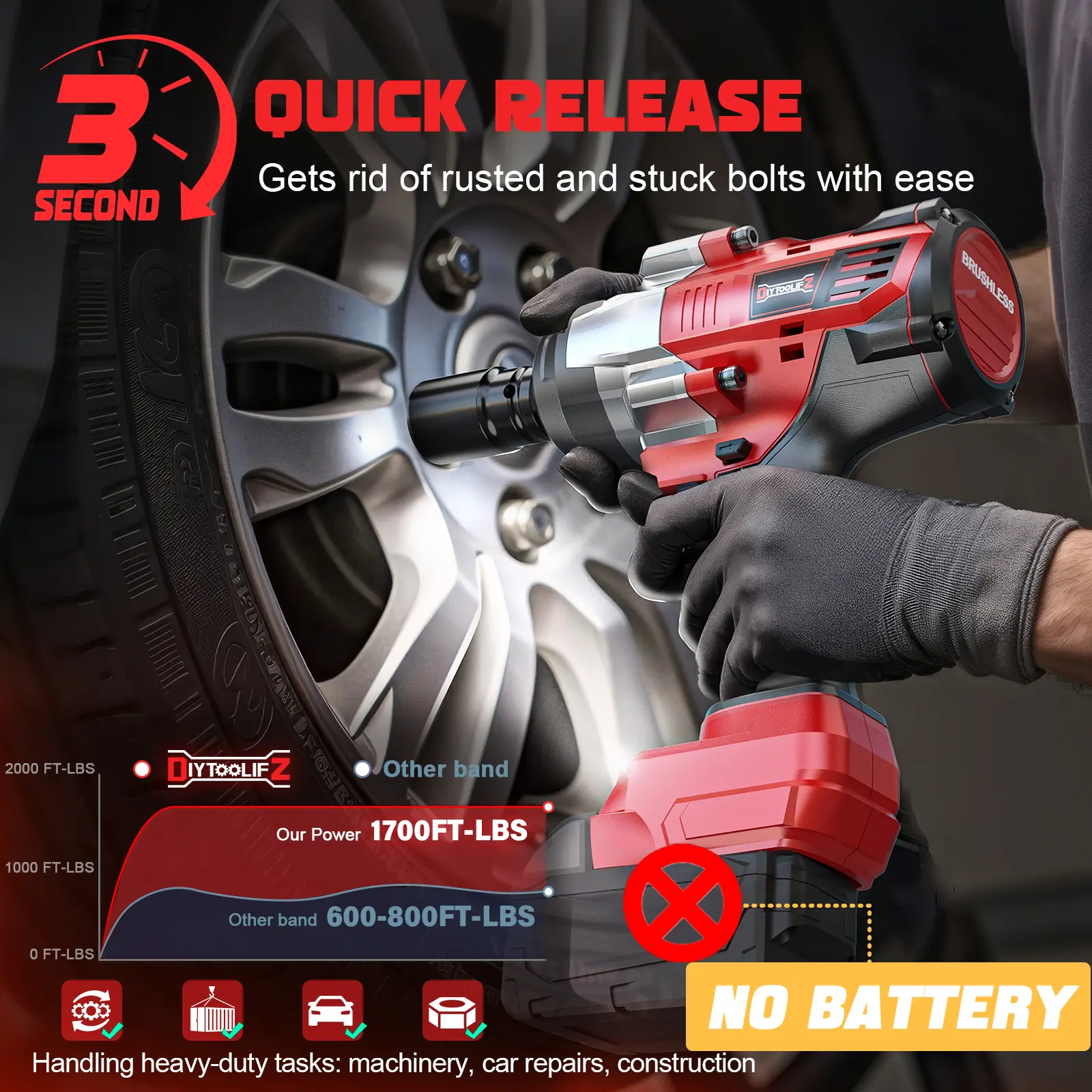 ·Variable Speed & Brushless Motor: Get more done with the DIYtoolifz High-Torque Impact Wrench! It offers 3 forward speeds, 1 reverse speed, and auto-stop for precise control (0–1850 RPM), helping prevent over-torquing.The brushless motor extends runtime by 60% compared to traditional motors—a powerful upgrade for toolbox.