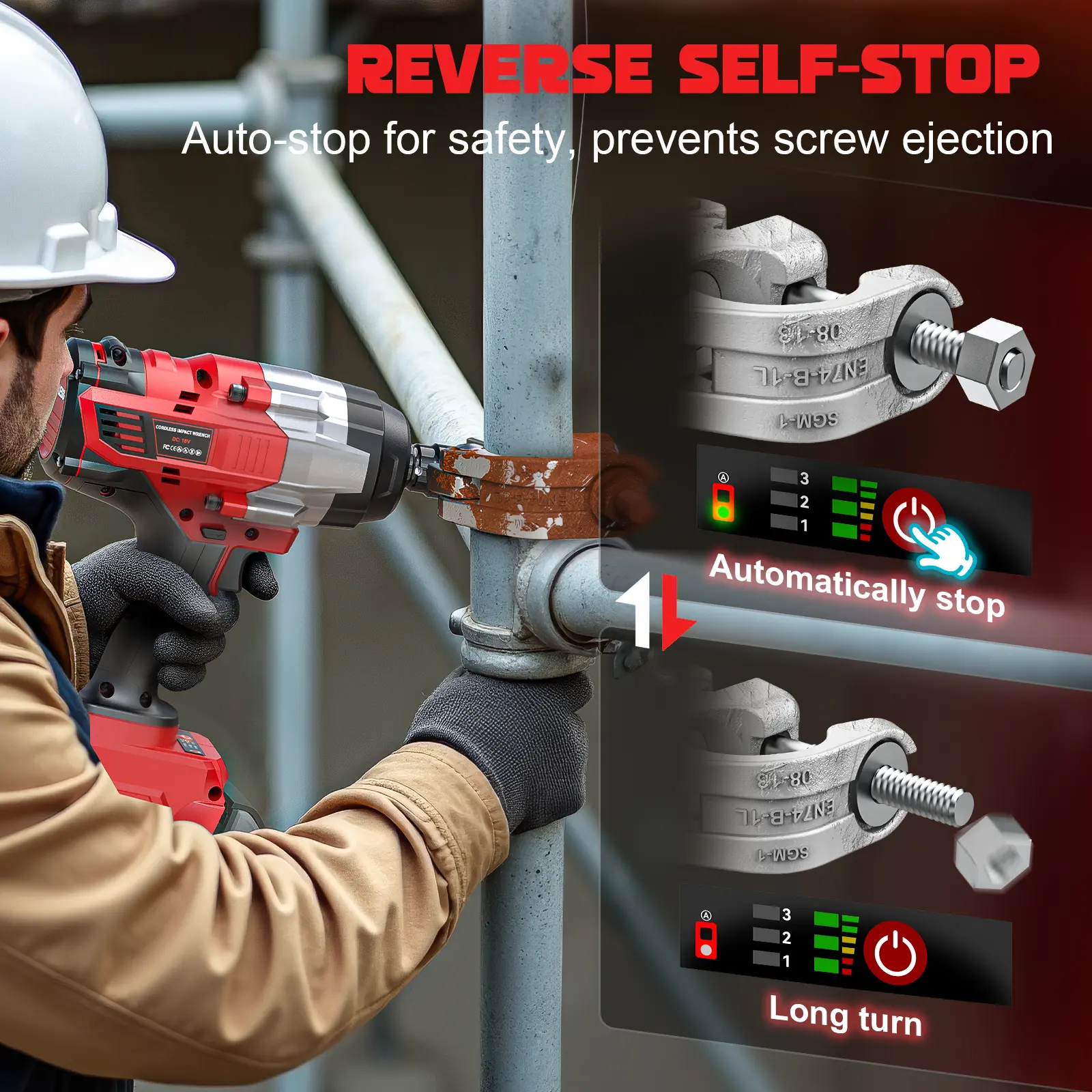 ·Reverse Auto-Stop Function: Automatically stops when the bolt is loosened to prevent over-torquing and protect threads. Ideal for precise tasks like auto repairs, machinery work, and assembly. Just toggle the forward/reverse switch (marked with a reverse arrow) on the wrench, and you're ready to go.