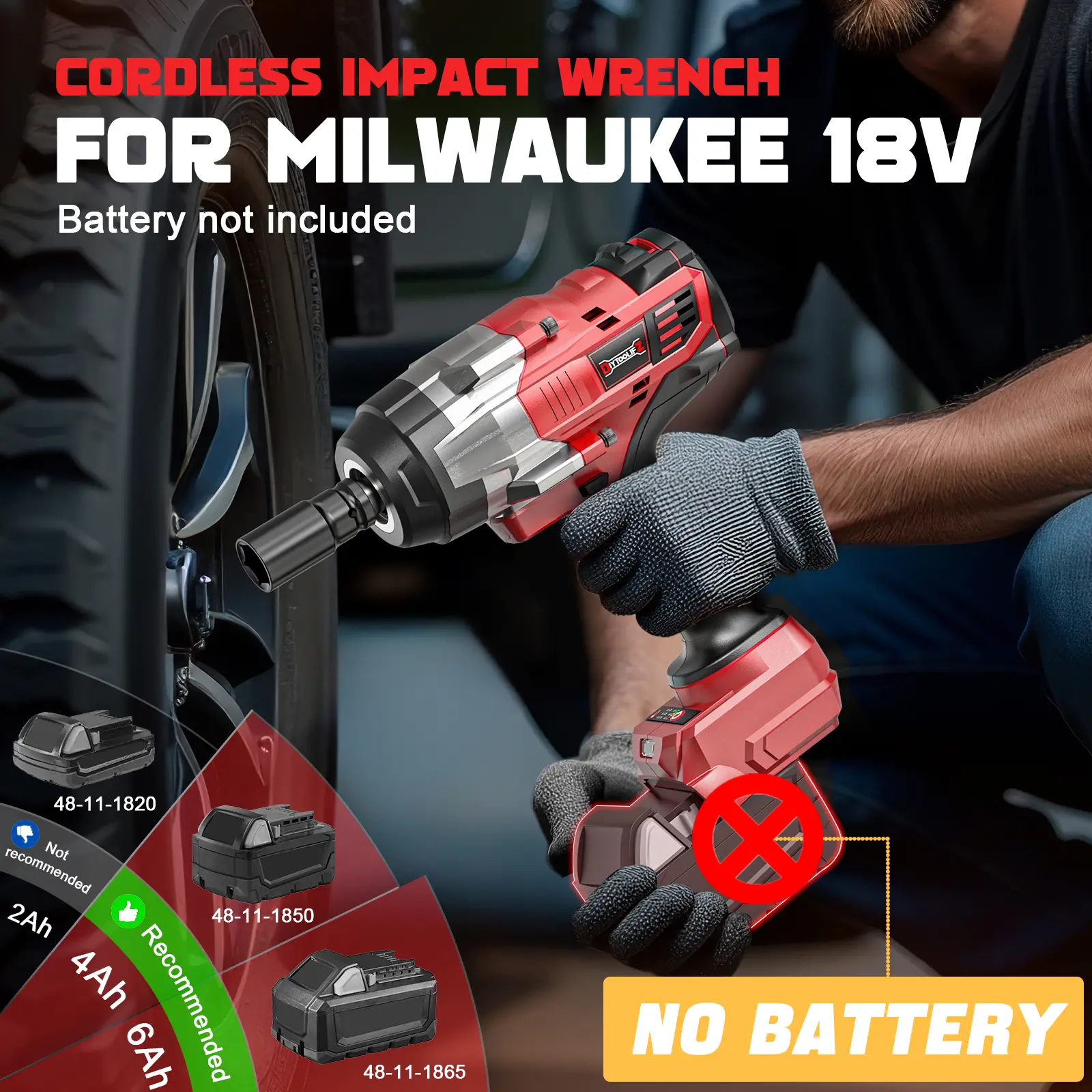 ·This power impact wrenches does NOT INCLUDE any batteries and impact sockets attachment. It is compatible with Milwaukee 18V batteries.
