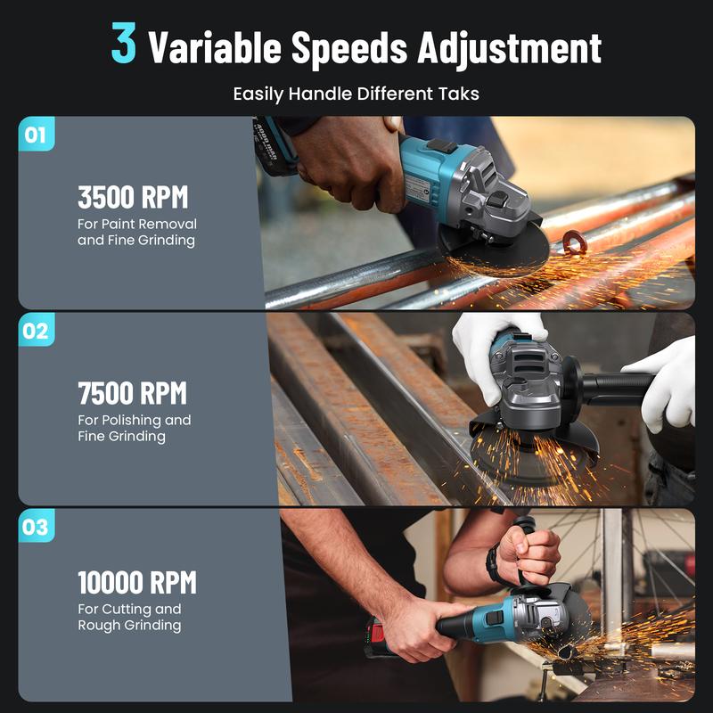·High Performance Brushless Motor:This variable speed angle grinder is equipped with a high-efficiency brushless motor that can provide a maximum power of 10000 (adjustable among Low-5000RPM, Middle-7500RPM and High-10000RPM). Compared with pure copper motors, brushless motors have a longer service life, lower energy consumption, and greater power