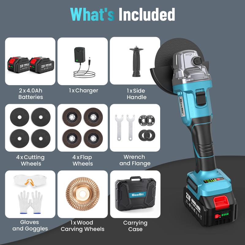 ·Extensive & Complete Accessories:A complete set of high-quality power tools can help you save a lot of time and troubles. Our cordless grinderes set includes:1x 4-1/2-Inch grinders power tools;2x 4.0ah battery;1x fast charger;4x cutting wheel; 4x flap wheel;1x wood carving wheel;2x wrench;1x safety gloves;1x safety glasses. Just need a simple Seesii power angle grinders set to get many power tools and accessories you need