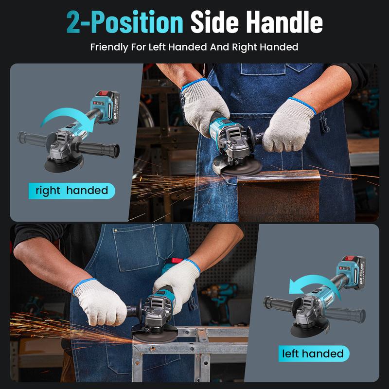 ·2-Position Auxiliary Handle:Considering the needs of different groups of people (left-handed & right-handed), our cordless grinder tool has designed a screw-in detachable handle that you can install on the left or right according to your own needs