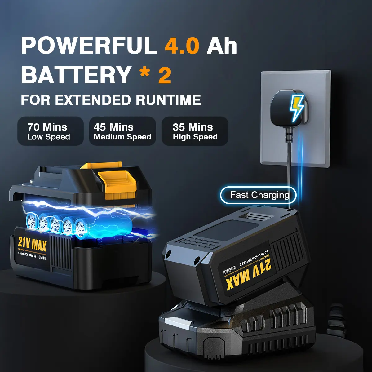 Equipped with dual 4.0Ah batteries for longer runtime and no frequent charging. Includes a fast charger for quick recharging and minimal downtime.