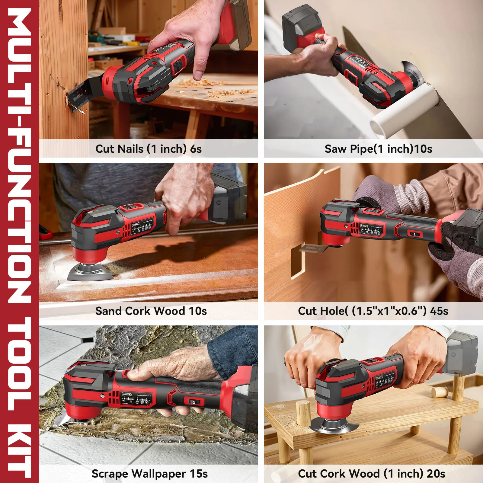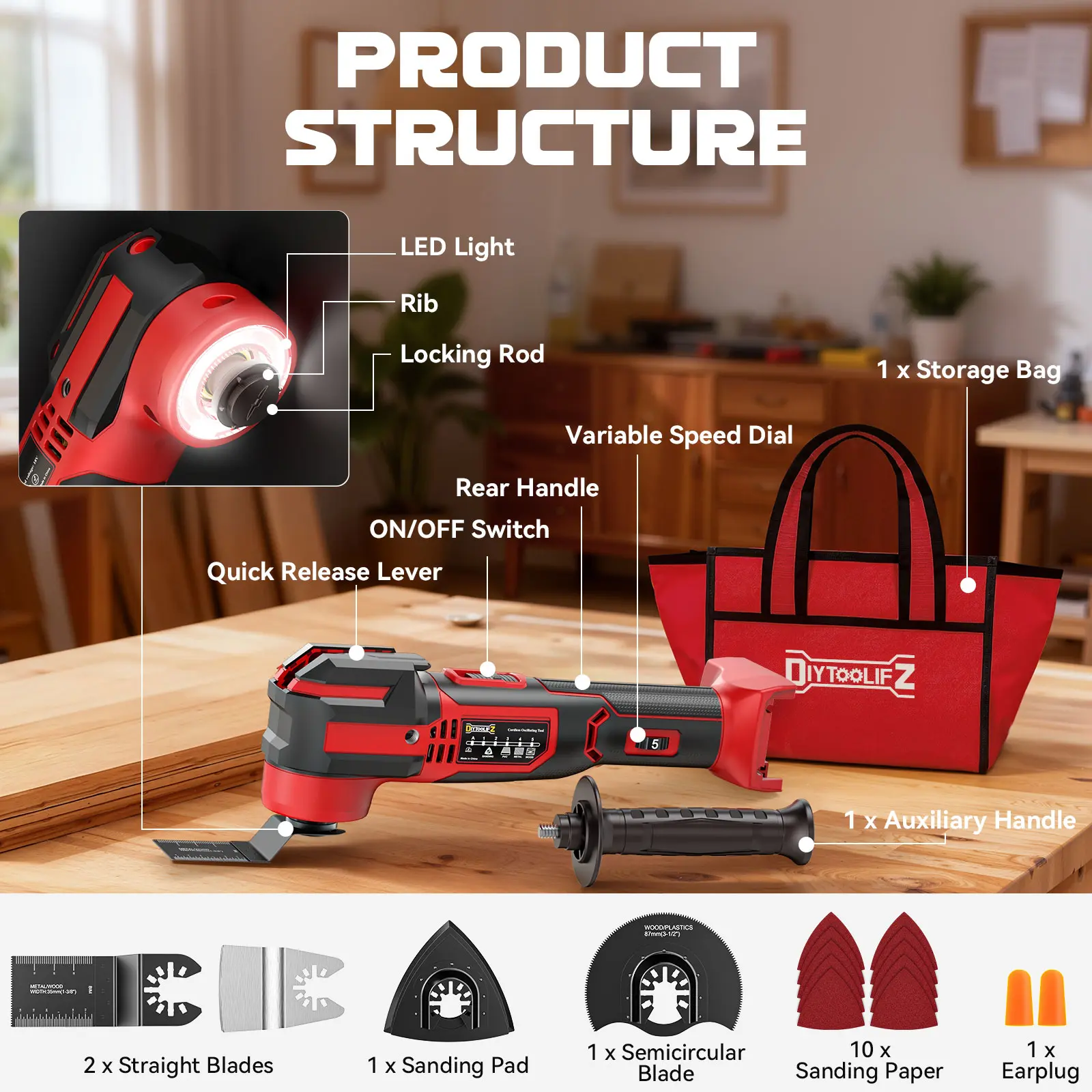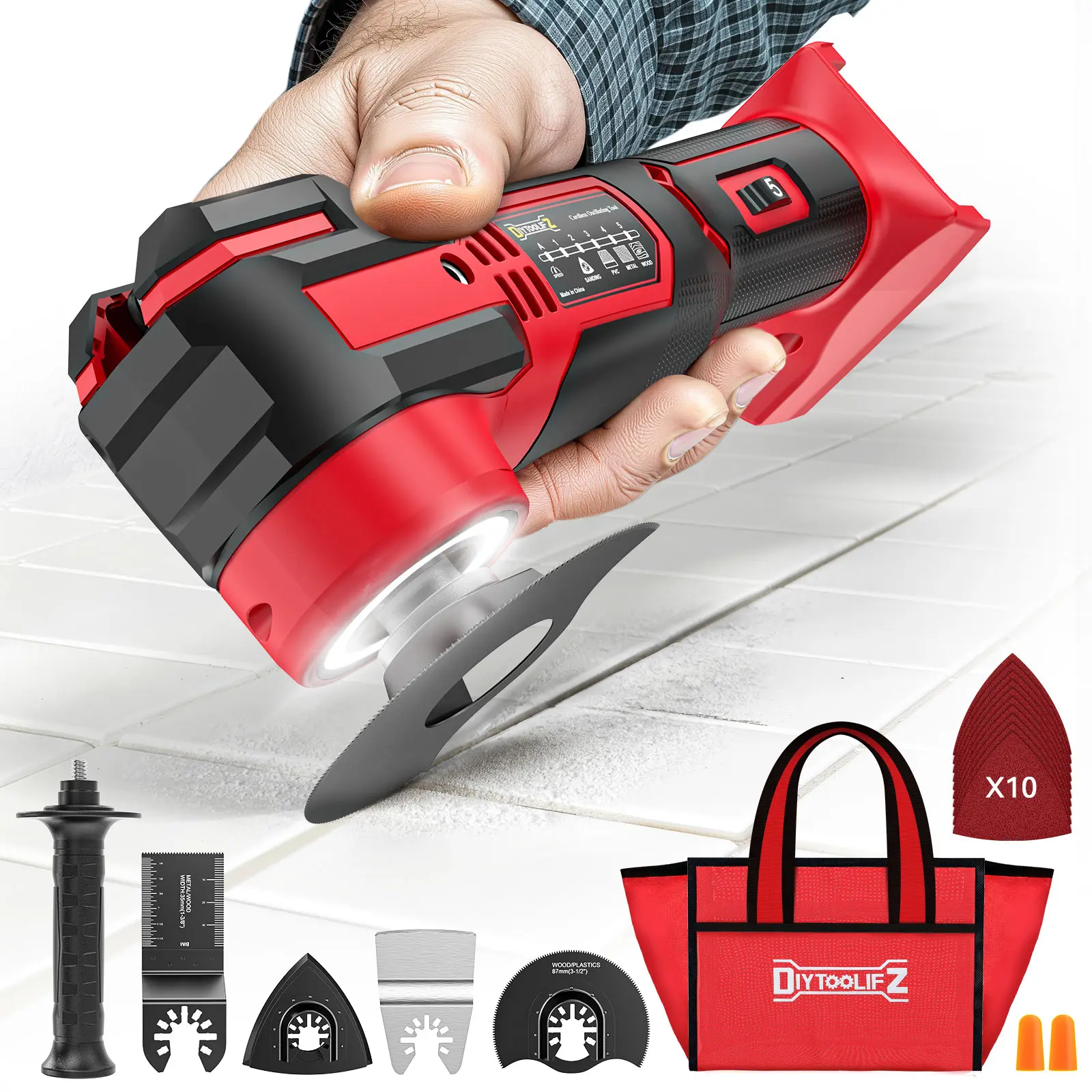 ·[17-Piece Multi-Purpose Kit for Every Job] Includes 1 oscillating tool, straight oscillating saw blade, semicircular blade, semicircle blade, sanding pad, 10 sanding paper, dual-position handle, earplug and a tool bag. Quick, tool-free blade changes allow seamless transitions between cutting, scraping, and sanding—ideal for all DIY and home-renovation tasks.