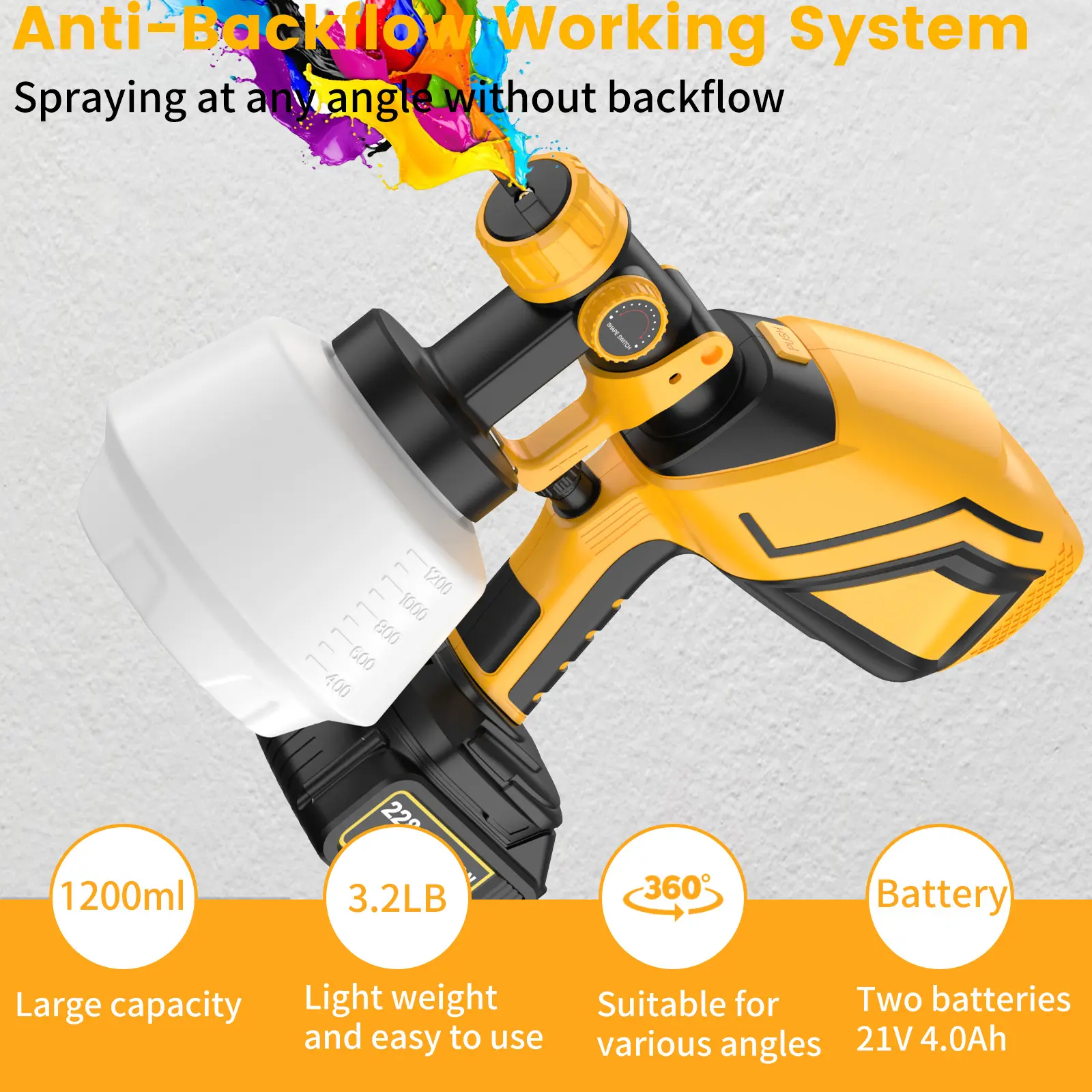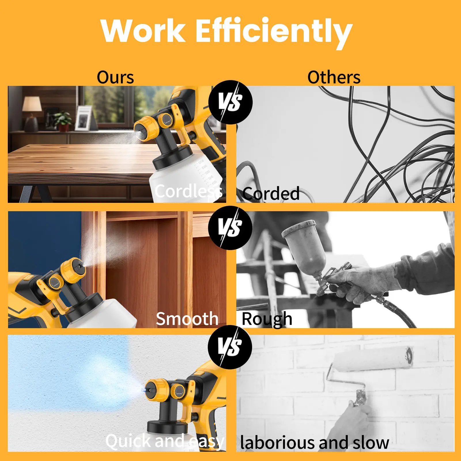 【WIDE APPLICATION】This high pressure cordless paint sprayer is perfect for all kinds of paint spraying applications, including indoor and outdoor walls, ceilings, furniture, suitable for both water-based and oil-based paints, it is a good helper for you when you are working.