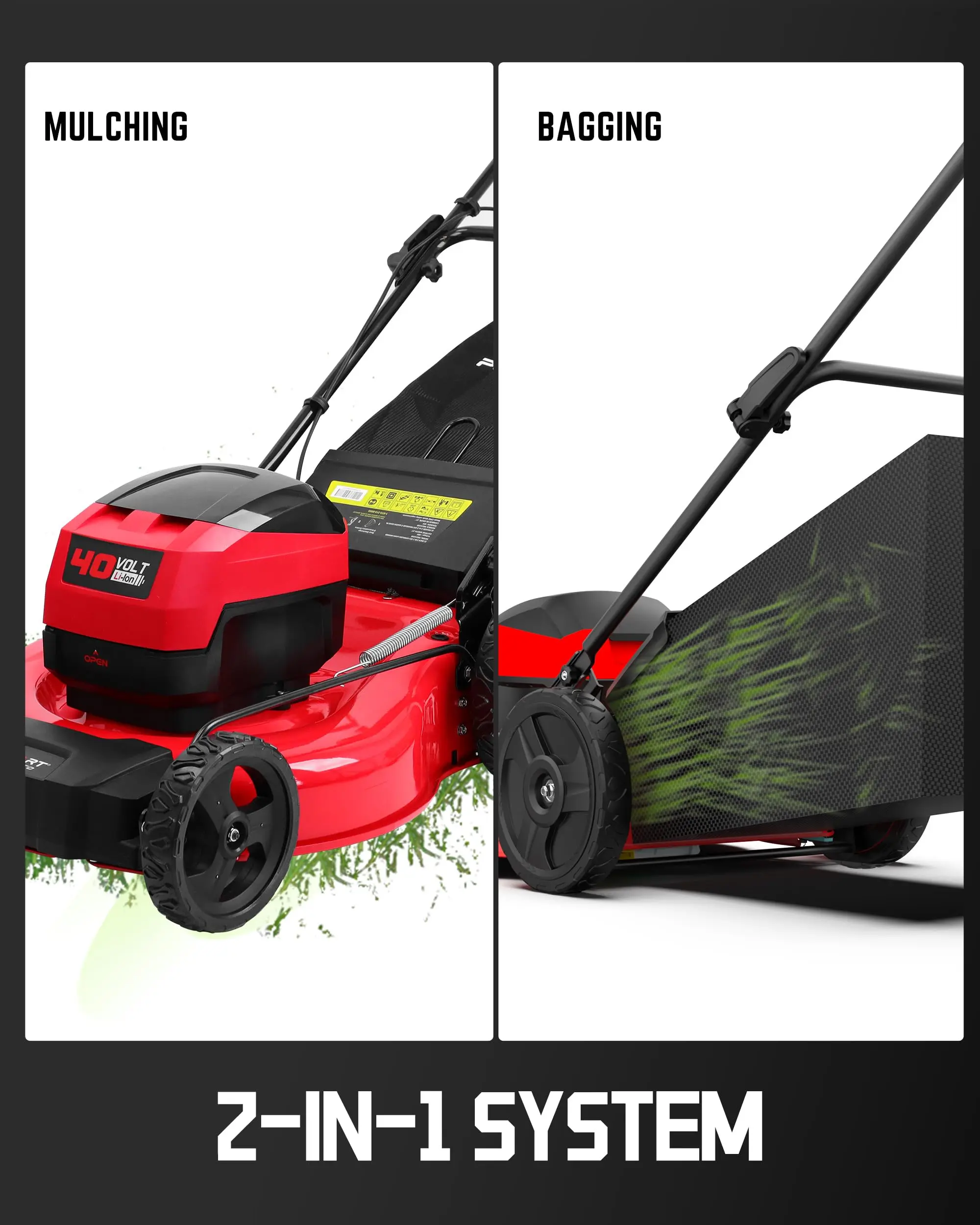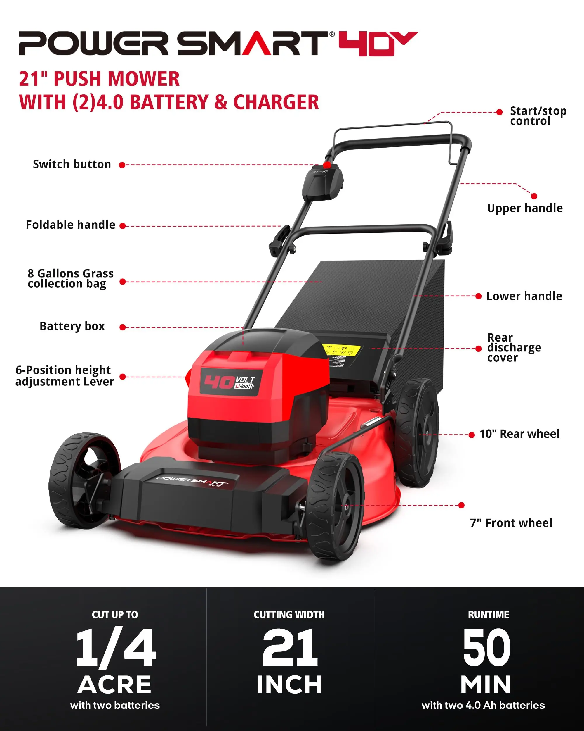 ·Includes: 21" push lawn mower, 2 x 40V 4.0Ah battery, charger, grass collection bag, and manual. 2-year service and lifetime tech support.