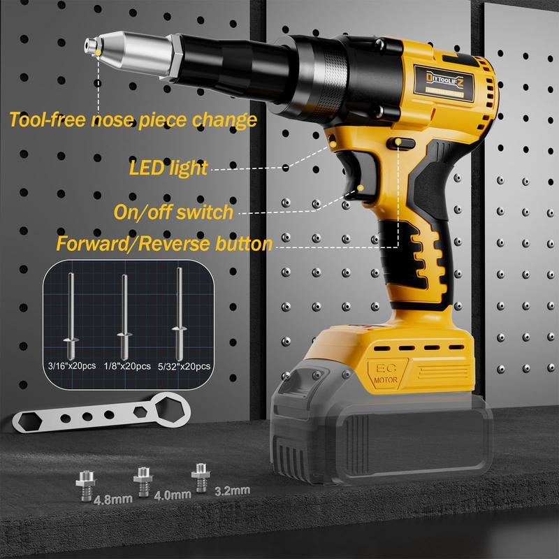Cordl]ess Convenience: The cordless rivet tool is compatible with Dewalt 20V battery(Battery NOT Included!!). Battery powered for pop rivet tool offer cordless convenience and empower you to take on task with unrestricted movement. Please kindly note that Battery NOT Included!!