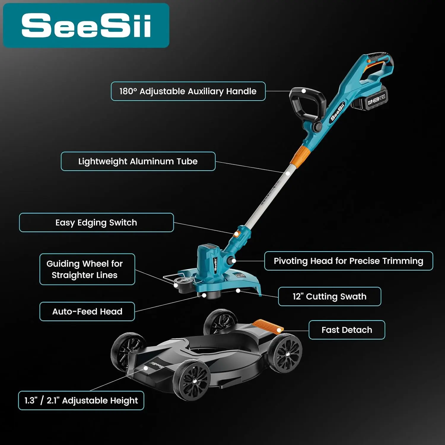 ·Designed for Outdoor Spaces: Whether you're mowing your backyard, trimming flower beds, or edging pavers, Seesii cordless string trimmer adapts to all your needs. With adjustable height deck (1.3''/2.1'') for different grass conditions, a telescoping shaft for personalized comfort, and a guiding wheel for straighter lines and cleaner cuts, this mower brings ease and satisfaction to lawn maintenance.