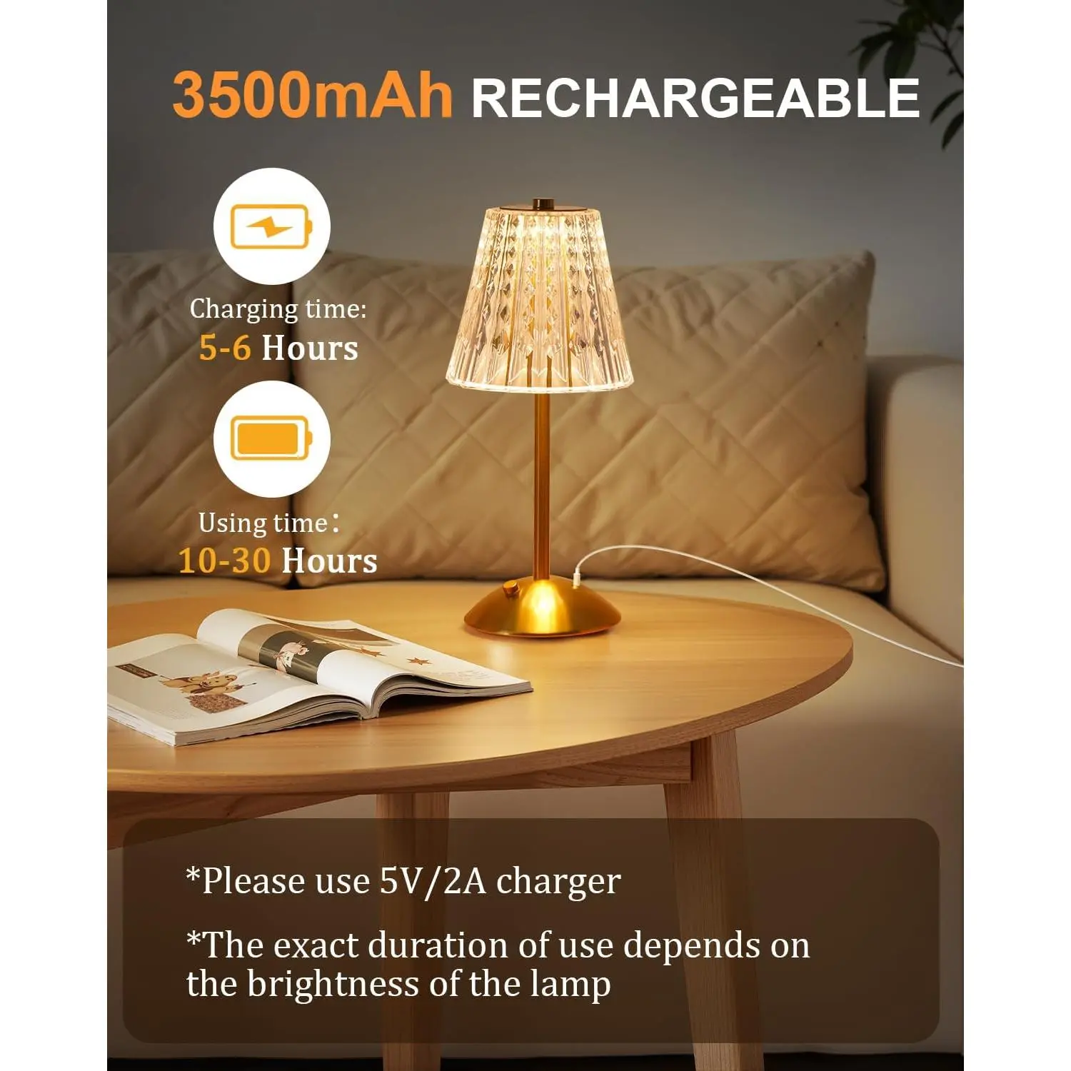 5. Cordless Touch Table Lamp, 3500mAh LED Rechargeable Small Dask Lamp, 3 Colors Dimmable Battery Operated Crysta Lamp for Bedroom Restaurant Kitchen Home Decor, Gold